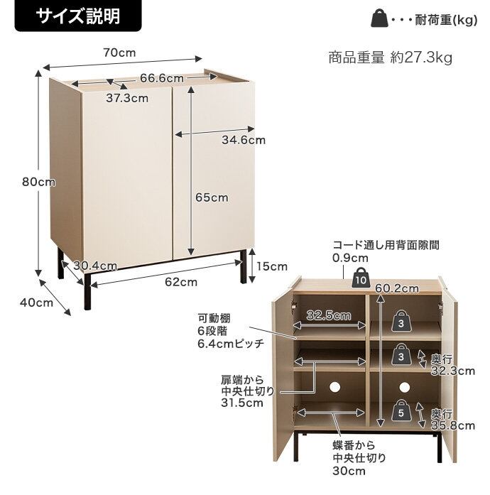 〇重量:【商品重量】約27.3kg 【耐荷重】天板:10kg、可動棚(各):約3kg、底板:約5kg