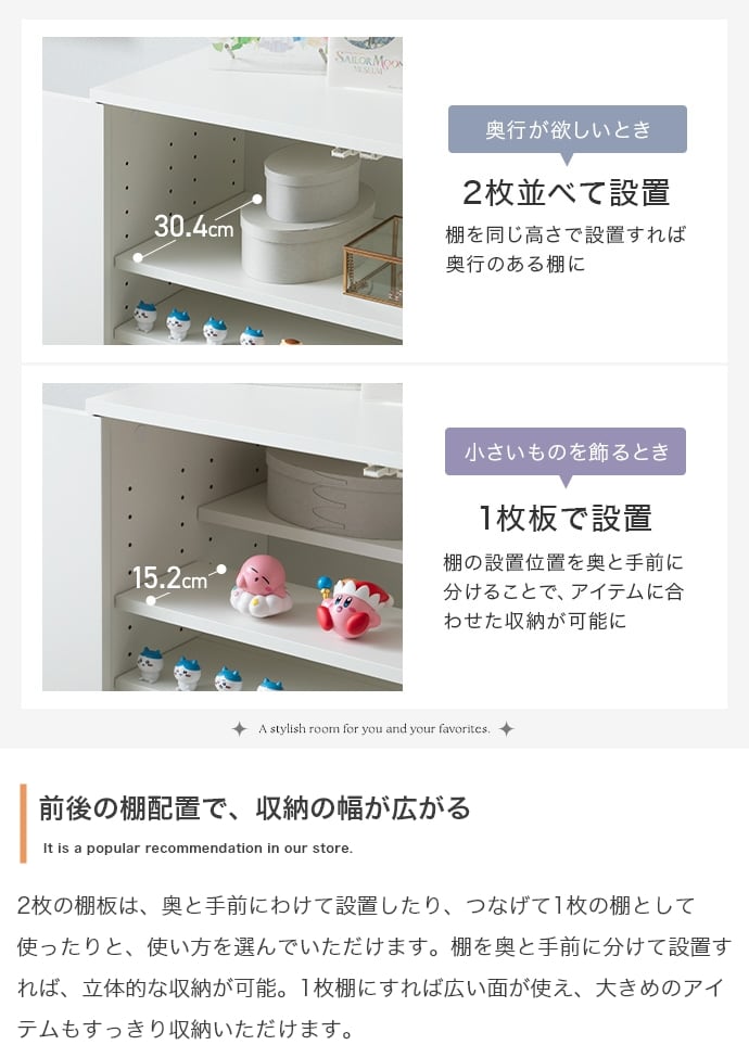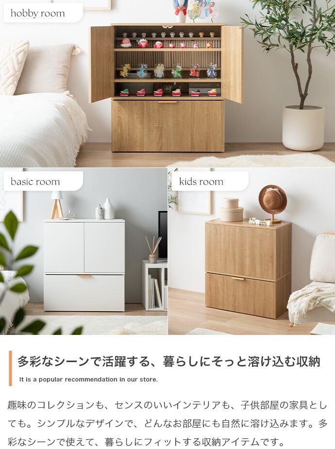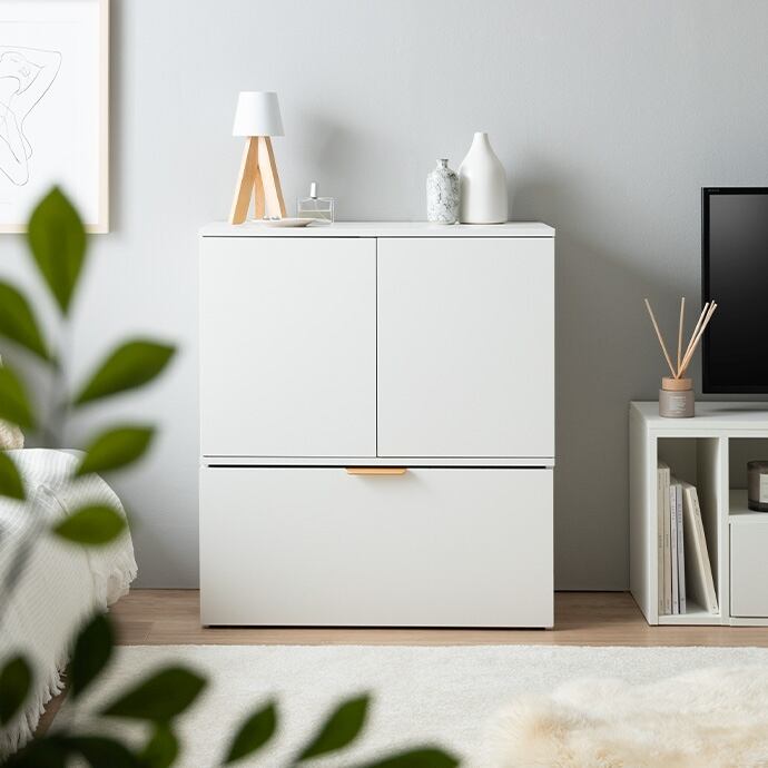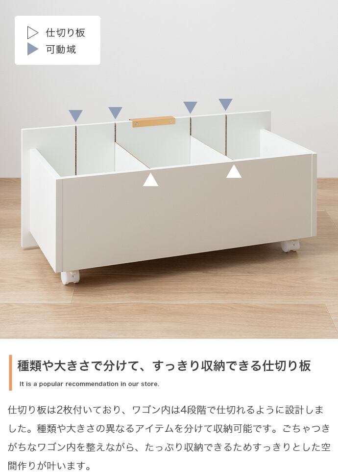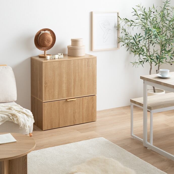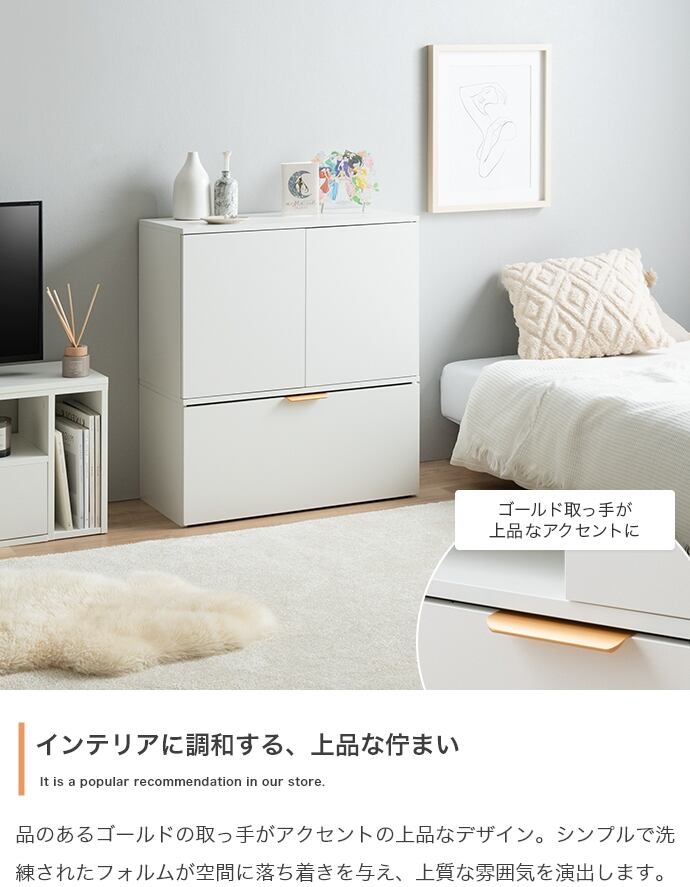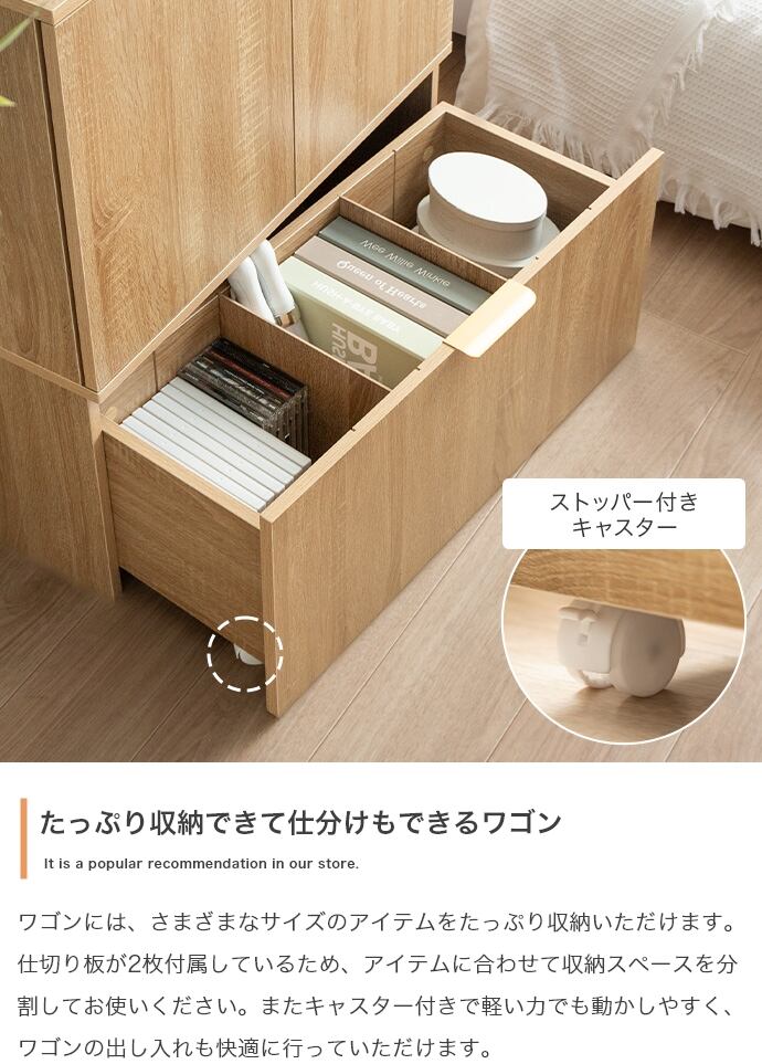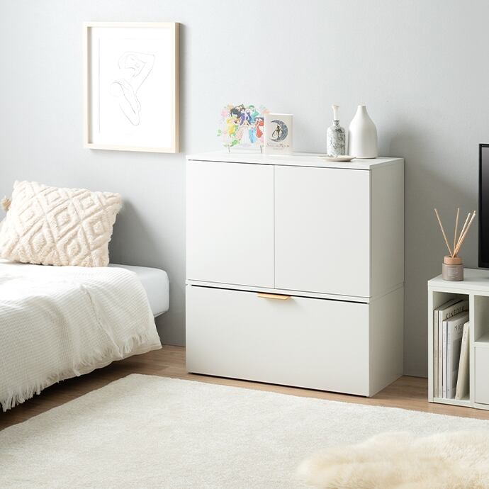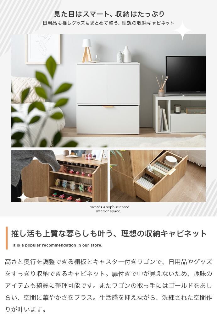 スマートな見た目ながら、たっぷり収納できる『Lekis(レキス)』収納ワゴン付きキャビネット。6枚の可動棚は高さや位置を自由に調整でき、小物から大きめなアイテムまで無駄なく収まります。またキャスター付きのワゴン内には仕切りがあり、収納物に合わせて仕切り位置を変えられるため、日用品も推しグッズもすっきり収納可能です。さらにワゴンの取っ手には上品なゴールドをあしらい、空間にさりげない華やかさをプラス。収納力と美しさを兼ね備えた一台で、生活感を抑えながら、洗練されたインテリアが叶います。