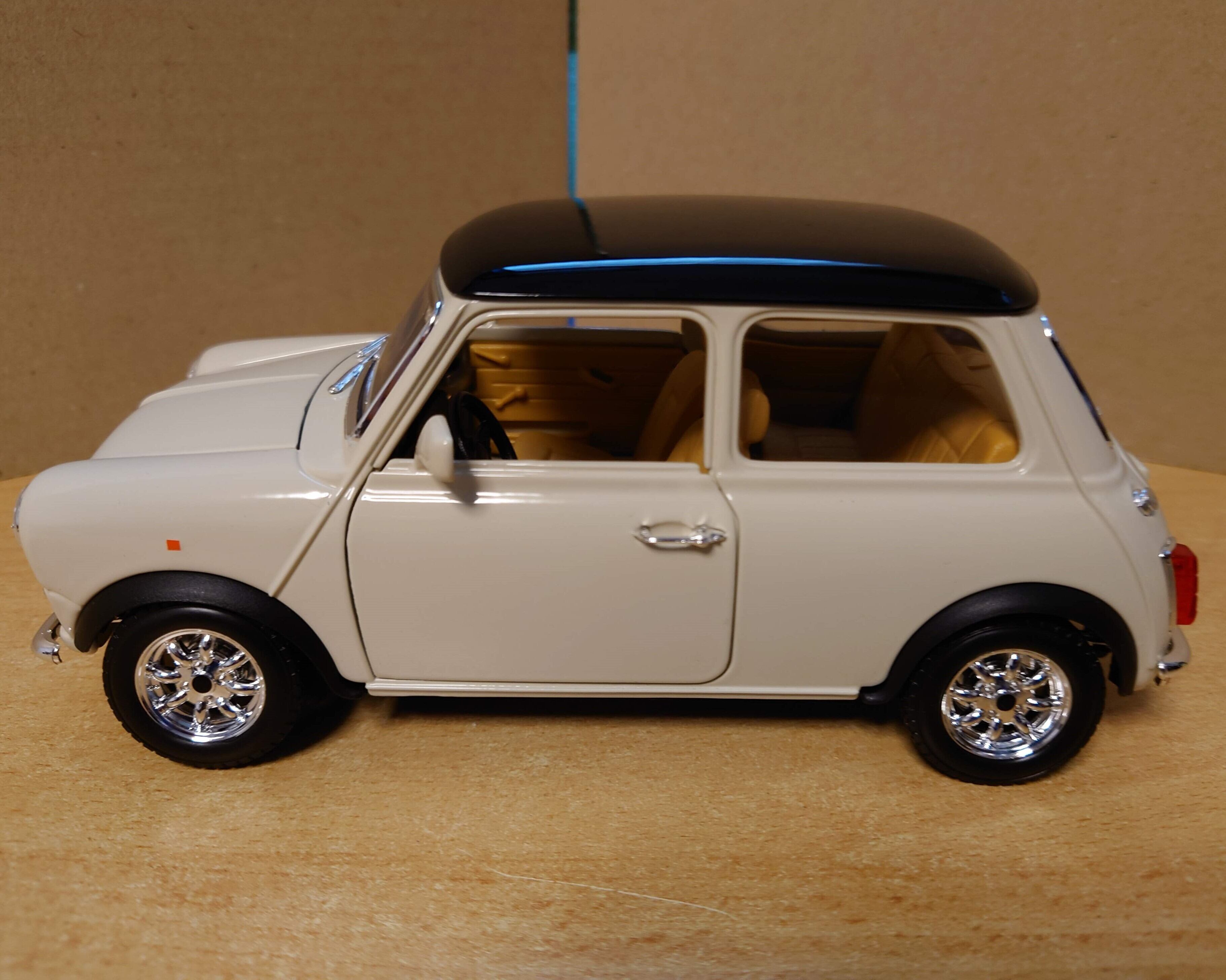 BMWが商標取得して製造販売する以前、イギリスのブリティッシュ・モーター・コーポレーション(BMC)製の超小型高性能大衆車だ。当時珍しいFF車で、合理的設計も革命的と言われ賞賛された。愛らしいマスク・ボディと相まって大ヒットし、1959年~2000年までの41年間大きなモデルチェンジをすることなく製造が続けられた。BMW製ミニが登場したことで初代ミニはクラシックミニ・BMCミニ・ローバーミニとも呼ばれる。また、レースにも使われたスポーツグレードがミニクーパーだ。商品は1967年に細かく各所が改良されマーク2となったものです。