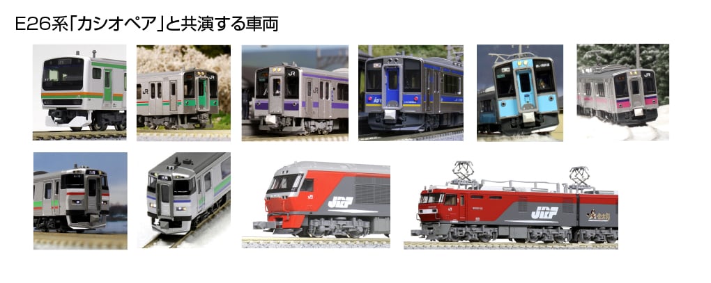 KATOは、上野発、北海道方面札幌行きの夜行列車として名を馳せた、E26系「カシオペア」を定期列車として活躍していた全盛期(2005〜2012年頃)の仕様で製品化。お手持ちの機関車で再現いただけるように電気機関車用のヘッドマークを付属いたします。機関車とともに往時の雰囲気をお楽しみいただけます
