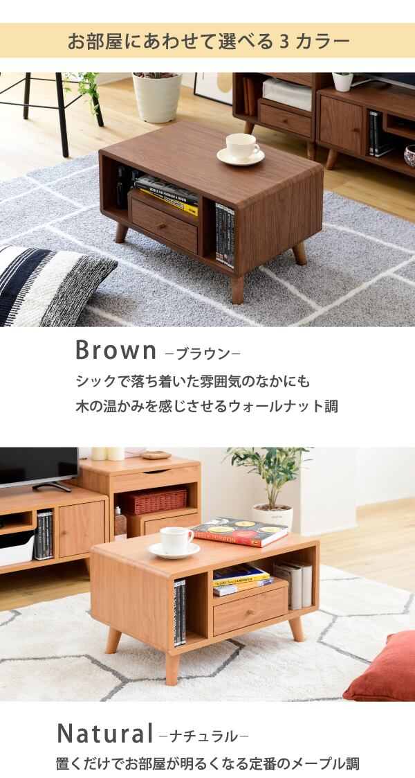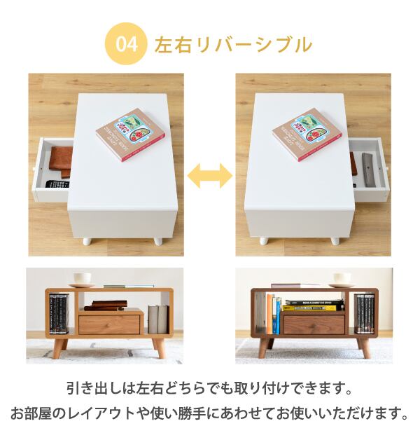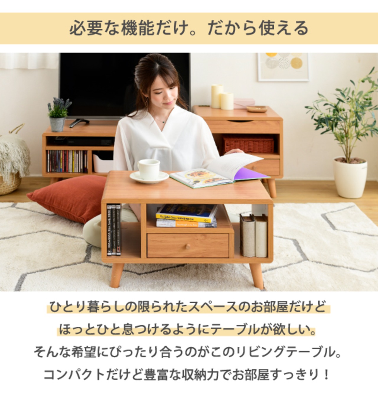 収納するものから設計されたデザインだから、コンパクトでも機能的。リビングテーブルとしての機能だけでなく、DVDやティッシュ、雑誌が収納できるオープン部、リモコンなどを収納できる引き出し付き。丸みのある北欧風のデザインはとてもおしゃれで、ひとり暮らしのお部屋にもぴったりです。