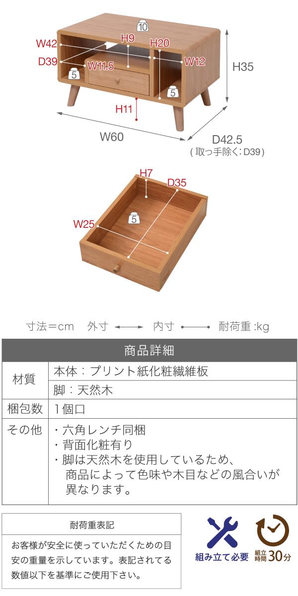 pico リビングテーブル 収納 幅60 奥行42.5 高さ35 Pico おしゃれ 引き出し付き かわいい 韓国風 コンパクト コーヒーテーブル 木製 収納付き リモコン収納