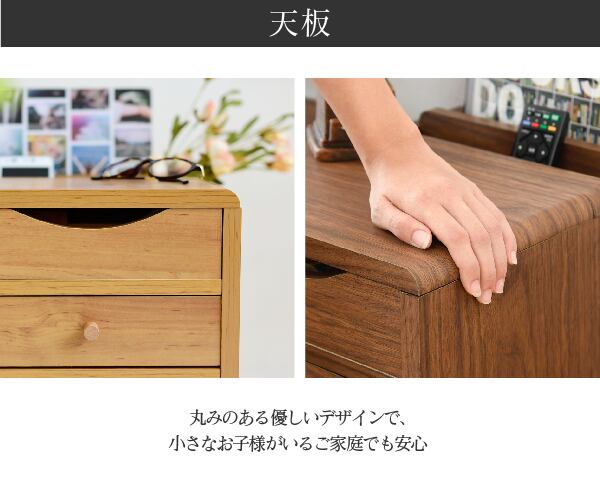 収納するものから設計されたデザインだから、コンパクトでも機能的。薄型の引き出し2段と、奥には雑誌を立てて収納できるオープンスペース付き。さらに天板を開くと仕切り付きの収納部もあるので整理整頓も簡単。丸みのある北欧風のデザインはとてもおしゃれで、コンパクトなのでひとり暮らしのお部屋にもぴったりです。
