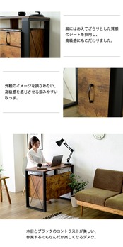 ヴィンテージ風シートがおしゃれなブルックリンスタイルのデスク。無骨すぎないデザインで男女問わずご使用できます。A4ファイルも収納できる大小2つの引き出し付き。