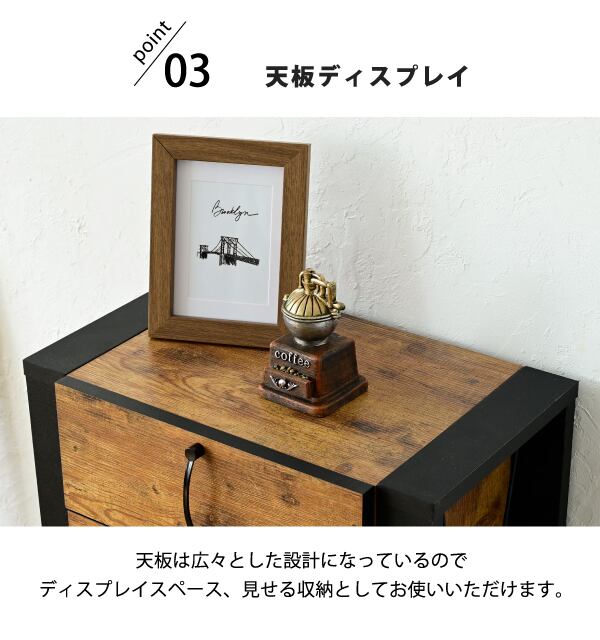 おしゃれなカフェの雰囲気を演出できる、ヴィンテージ風シートがクールなブルックリンスタイルのチェスト。無骨すぎないデザインで男女問わずご使用いただけます。大小3杯の引き出し。最下段はA4ファイルも収納できる深型の設計です。