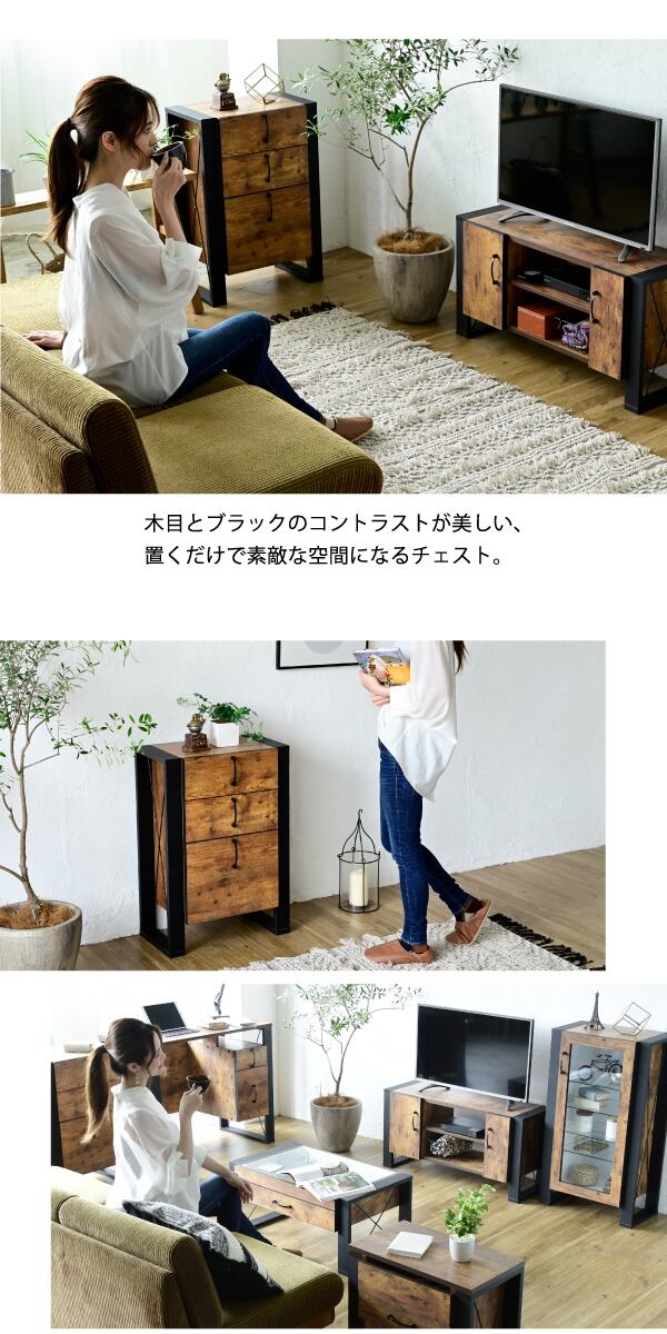 ヴィンテージ風シートがおしゃれなブルックリンスタイルのチェスト。無骨すぎないデザインで男女問わず使えます。大小3つの引き出しで整理整頓も簡単に。