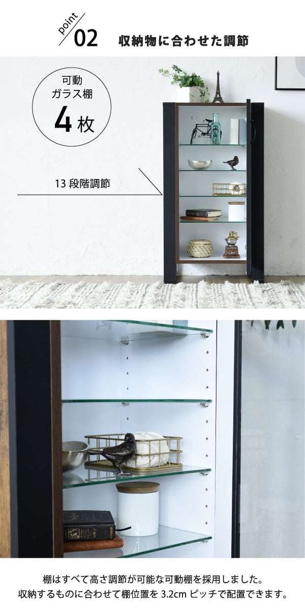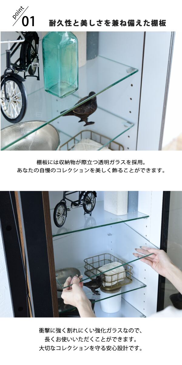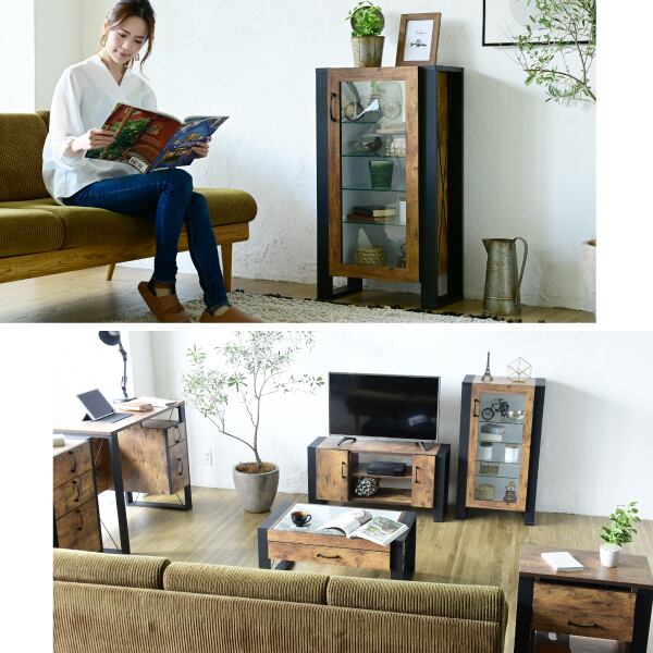 おしゃれなカフェの雰囲気を演出できる、ヴィンテージ風シートがクールなブルックリンスタイルのコレクションラック。無骨すぎないデザインで男女問わずご使用いただけます。ガラス扉&ガラス可動棚で「見せる収納」が実現できます。お気に入りの雑貨やフィギュアなどはここにディスプレイするのがおすすめです。