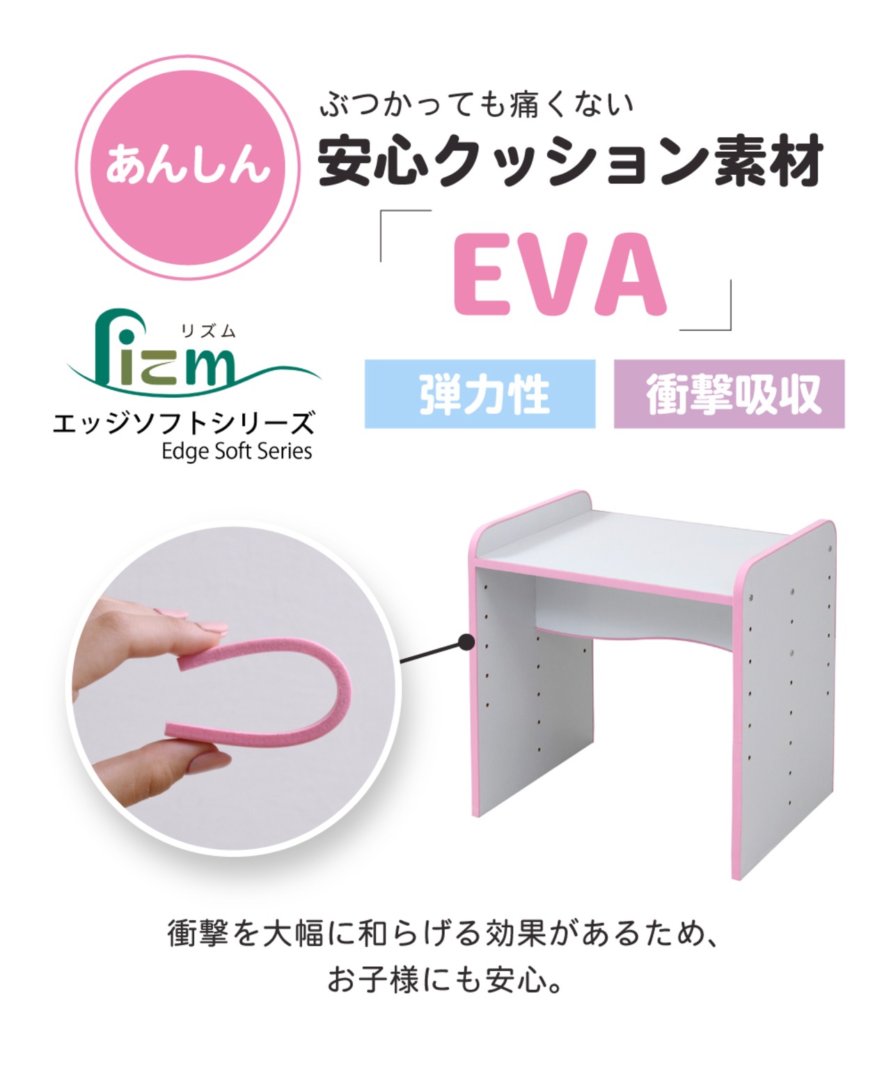 弾力性、衝撃吸収に優れたEVA樹脂をすべてのフチに採用。さらに角を丸くして金具の使用を極力減らした、小さなお子様も安全にご使用いただけるシリーズです。6段階の高さ調節ができるので、お子様の成長に合わせて長くお使いいただけます。