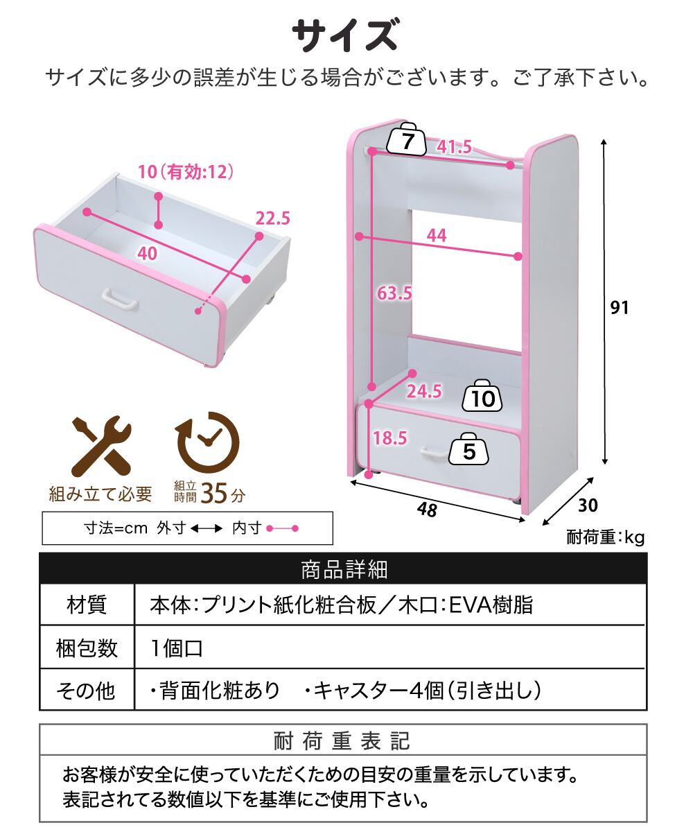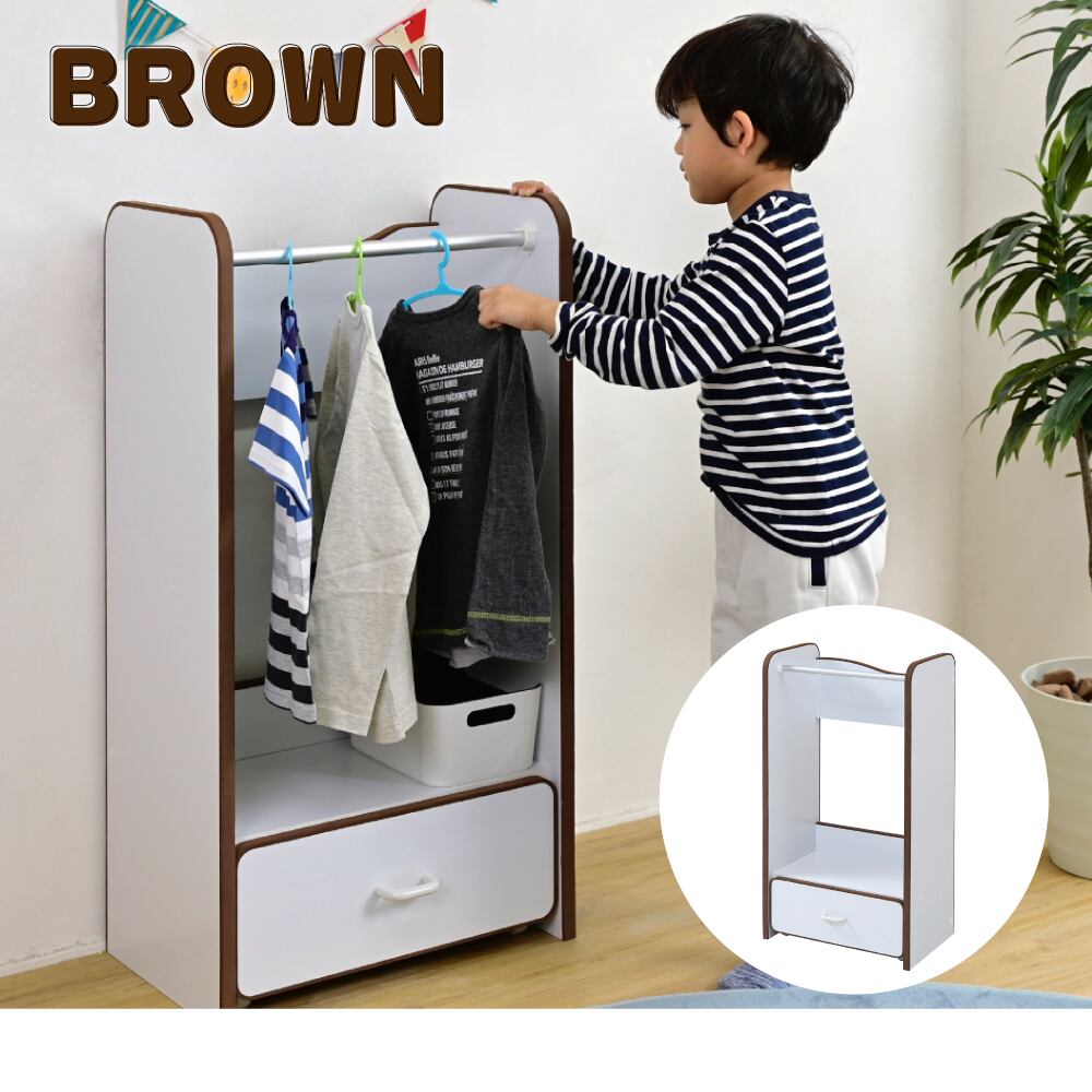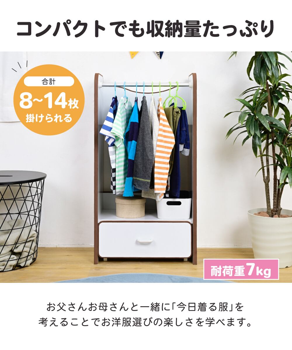 ソフトエッジで安全なキッズ 子供用 ハンガーラック 幅48 奥行29 高さ90 キャスター付き 引き出し 収納