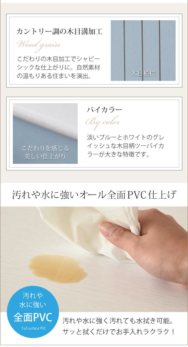 淡いブルーとグレイッシュなホワイトのバイカラーが特徴のフレンチスタイル。丸みのあるフォルムや、ディテールで魅せるカントリーテイストなキャビネット