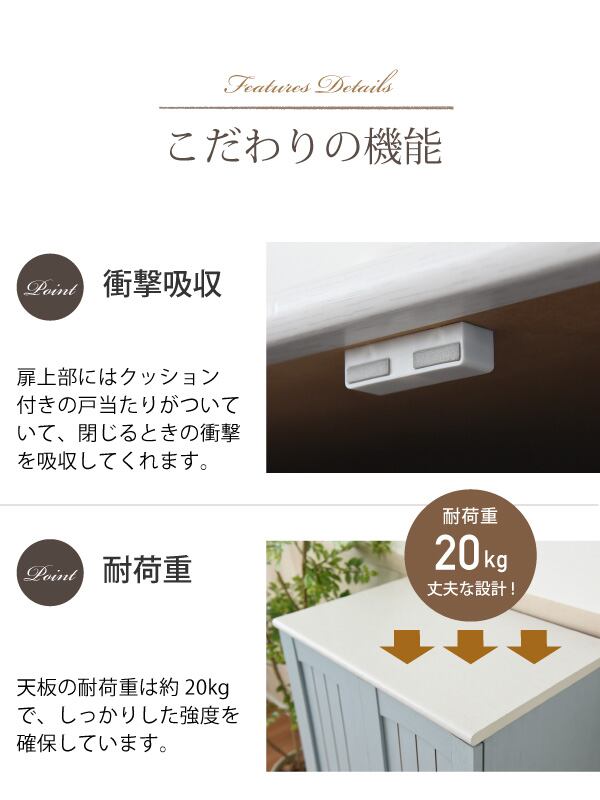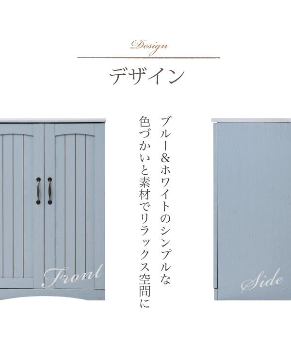 バイカラーで魅せるフレンチカントリースタイルのキャビネット。コンパクトサイズなので一人暮らしにも最適。扉収納の中は、可動棚で収納物に合わせて高さを自由に変えられます。丸みを帯びたフォルムと、アンティーク調の取っ手といったディテールがカントリーテイストを漂わせます。