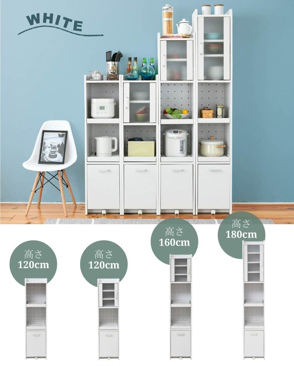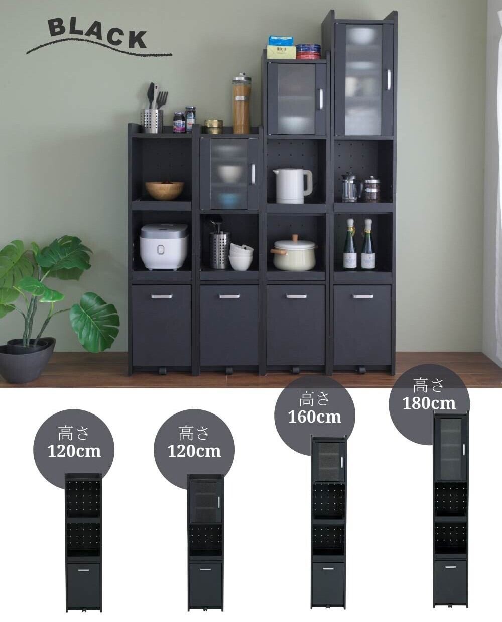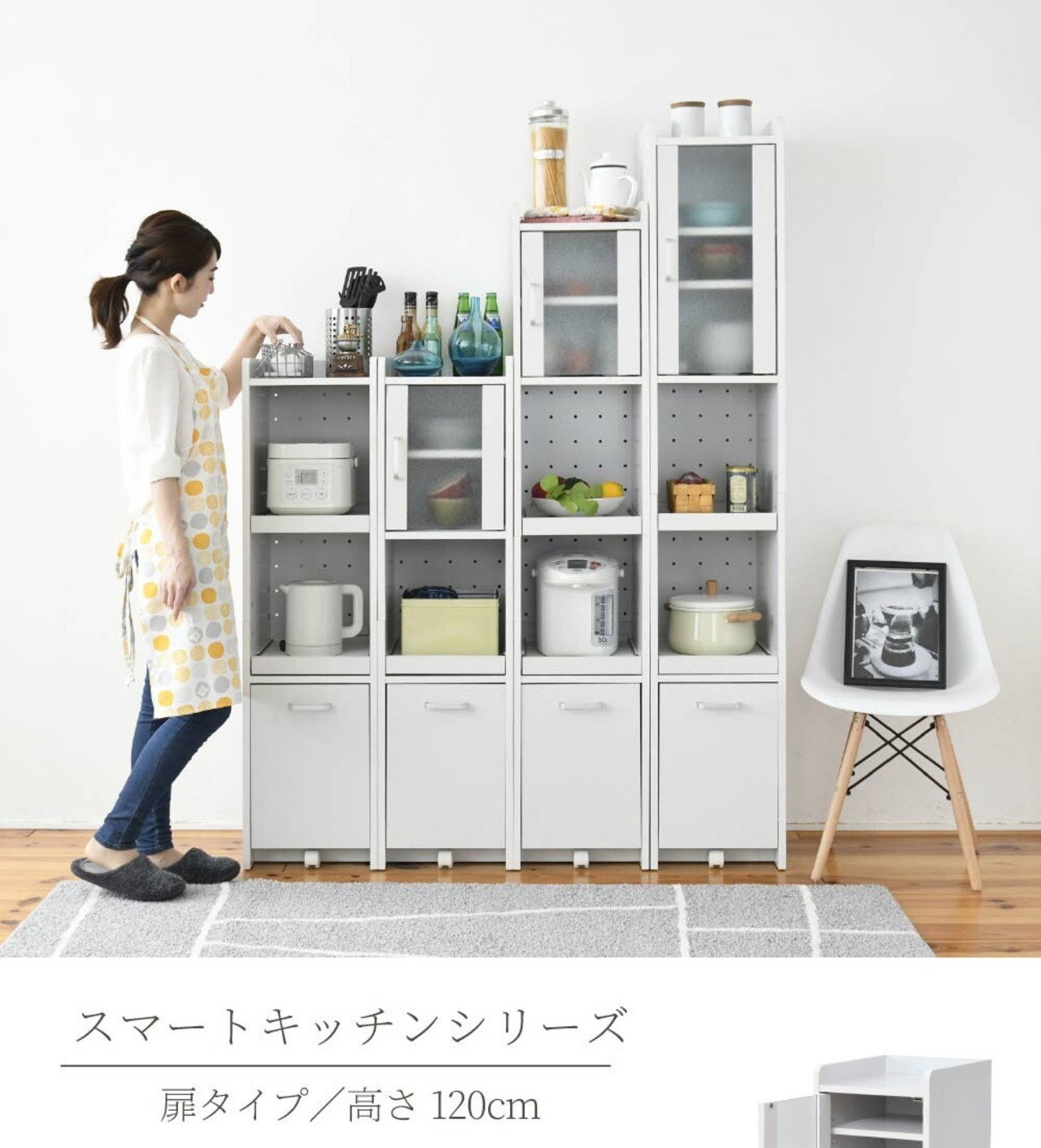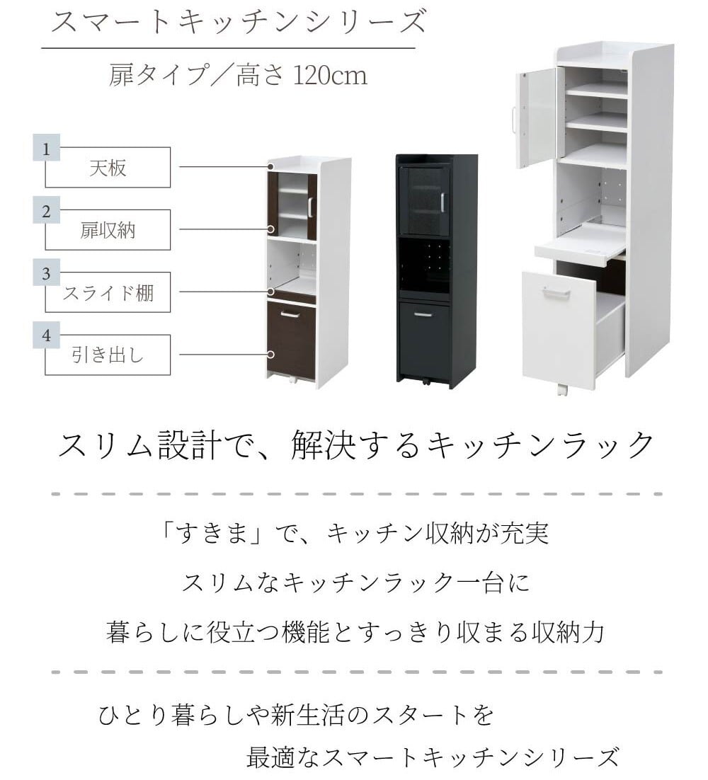 隙間タイプのキッチン収納。ちょっとした隙間や収納スペースにお困りの方にぴったりな、スリムタイプの家電収納家具。高さ120cmの扉バージョン
