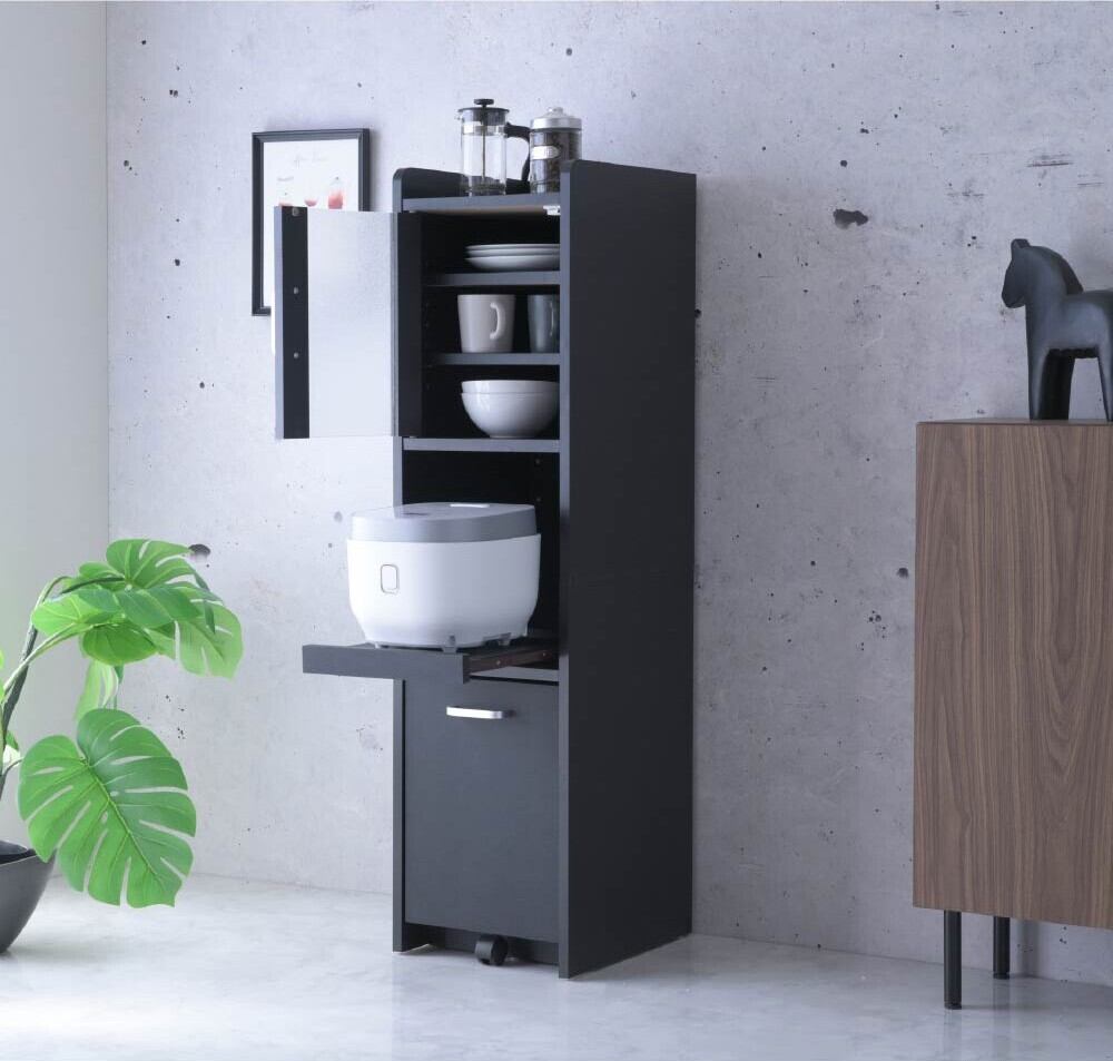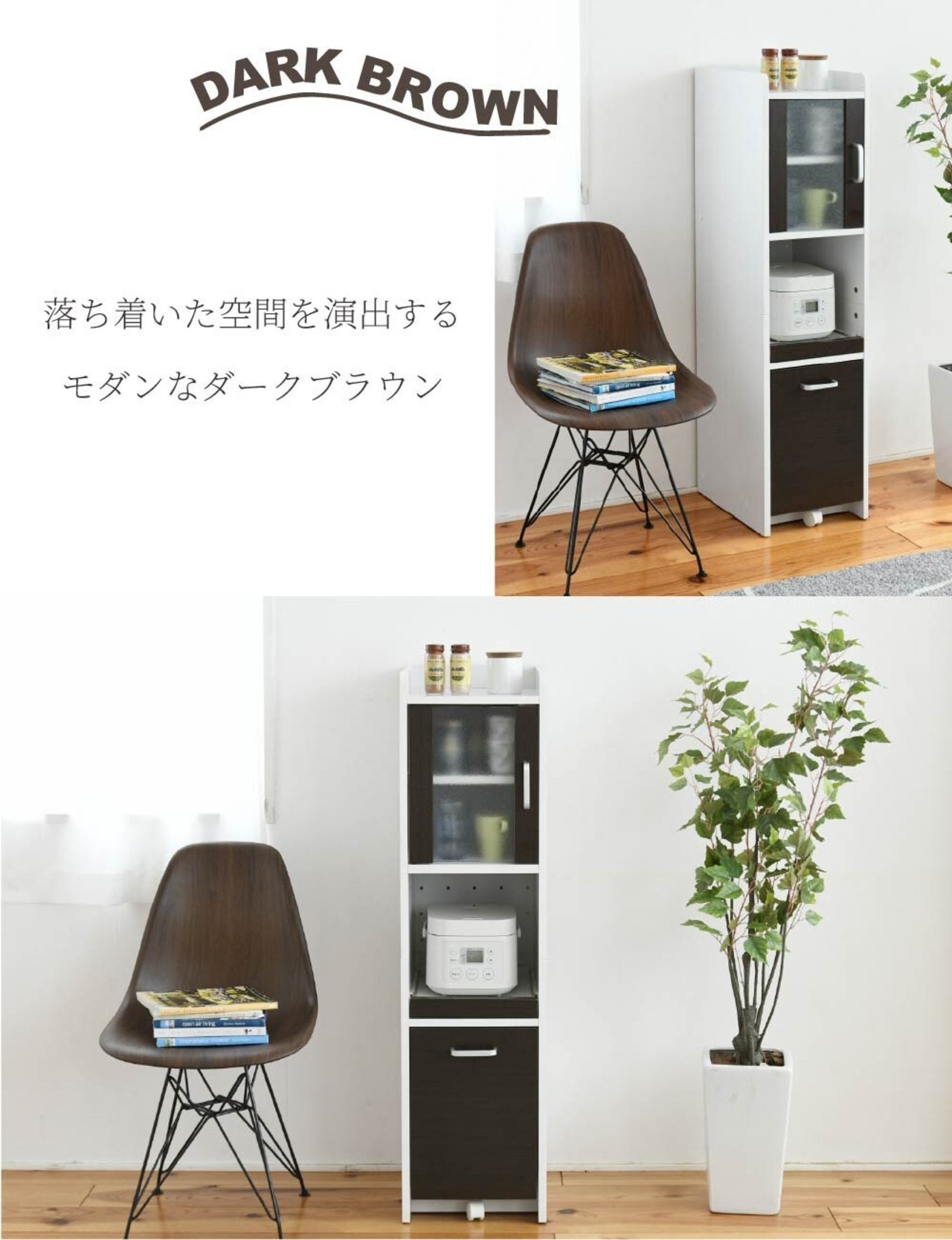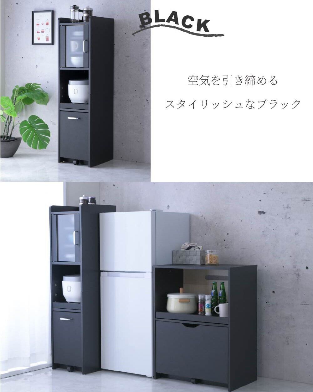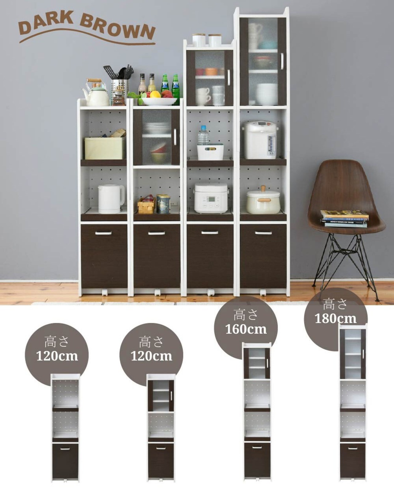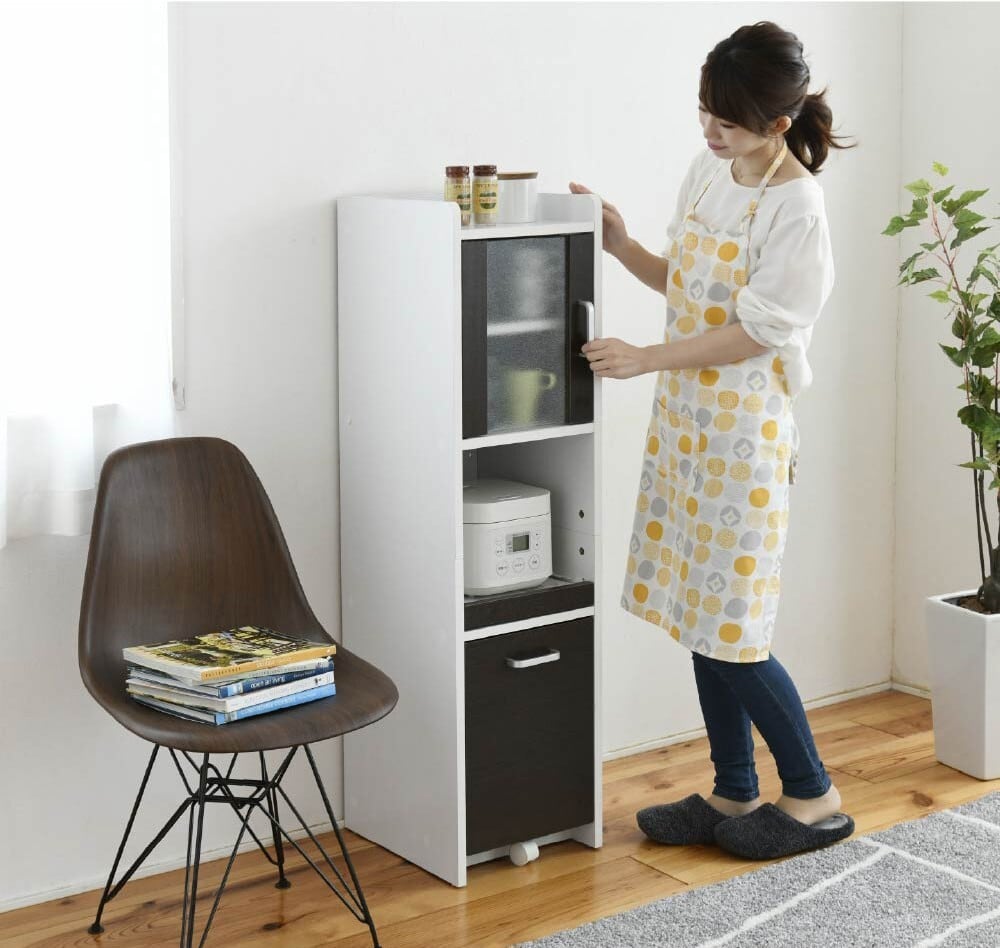 隙間タイプのキッチン収納。ちょっとした隙間や収納スペースにお困りの方にぴったりな、スリムタイプの家電収納家具。高さ120cmの扉バージョン