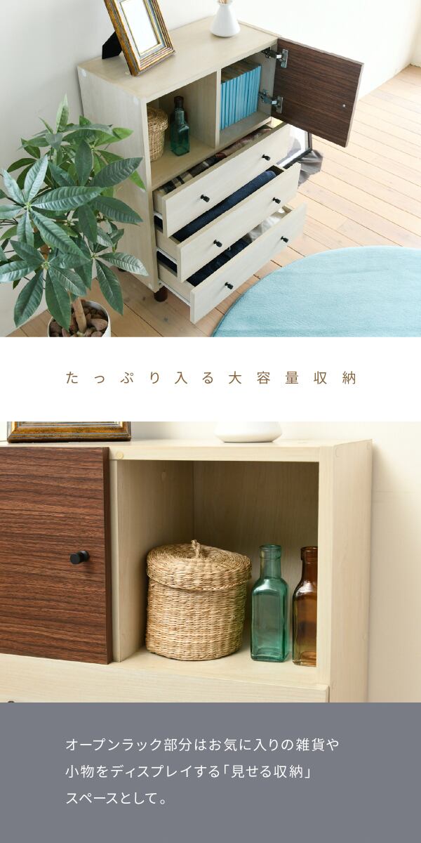 木目のあるナチュラル×ダークブラウンのツートーンで、ちょっぴりレトロな大人可愛いマルチチェスト。3段の引き出しには小物や雑貨を収納したり、ハンカチなどの衣類を収納しても◎引き出しの上部にはオープン、扉付きの収納もご用意。「見せる収納」「隠す収納」どちらも使用できるデザインです。同じシリーズ商品と自由に組み合わせることで、お部屋に合わせたレイアウトとオリジナル収納を実現できます。