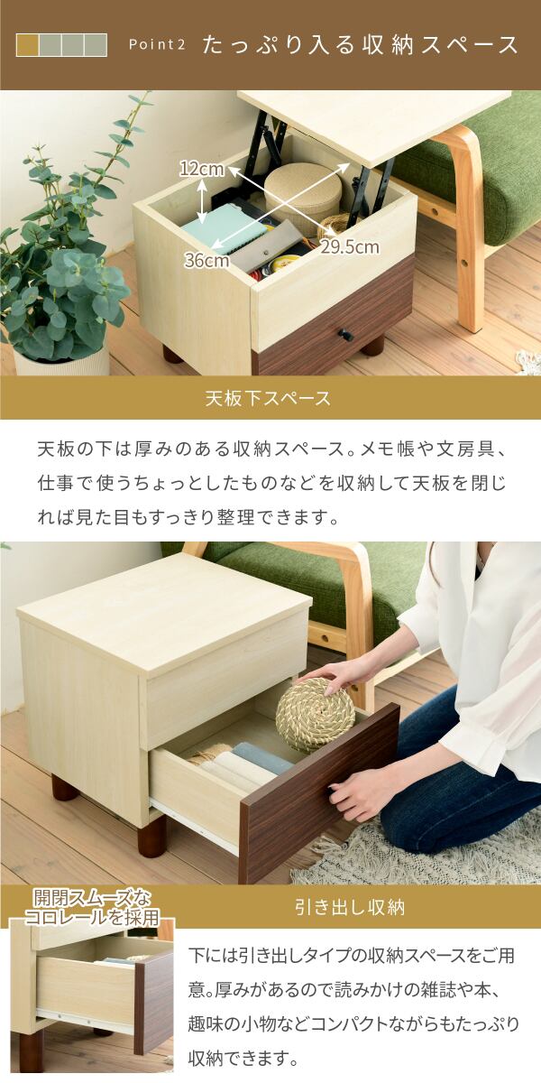 2toneBOX リフティング サイドテーブル リフトアップ 昇降 おしゃれ ソファ横 引き出し 幅40 奥行35 ナチュラル コンパクト 収納 マガジンラック ブラウン 木製