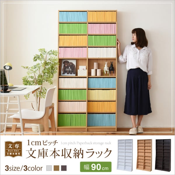 1cmピッチ 文庫本収納ラック 幅90 省スペース スリム 本棚 高さ 180 cm 木製 リビングシェルフ 棚板 かんたん調節 メモリ付き