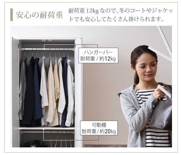 2つのハンガーバーと可動棚の高さは好きな位置に変えられるので収納物に合わせて使用できます。上にはアウター、下にはスカート。上には洋服、下にはストールやベルト、ネクタイなどのファッション小物と自由自在。