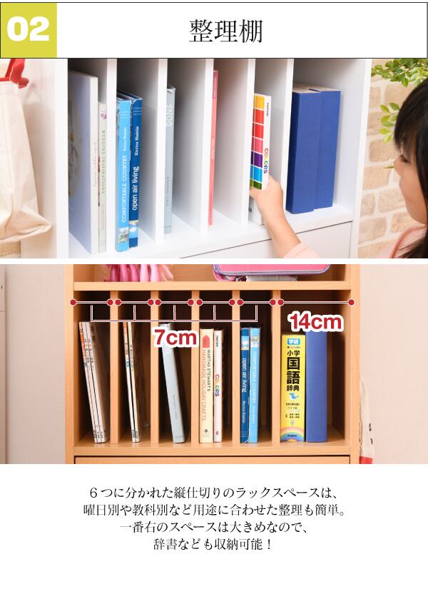 「リビング学習」にぴったりなキャスター付きのランドセルラック。真ん中の仕切り棚は6つに仕切られているので曜日や科目に合わせて収納できます。幅の広い右側は辞書などの収納に。真ん中の引出しはペンケース等や、学校から配られるプリント類に便利です。本体横は左右どちらにもフックの取り付けが可能です。