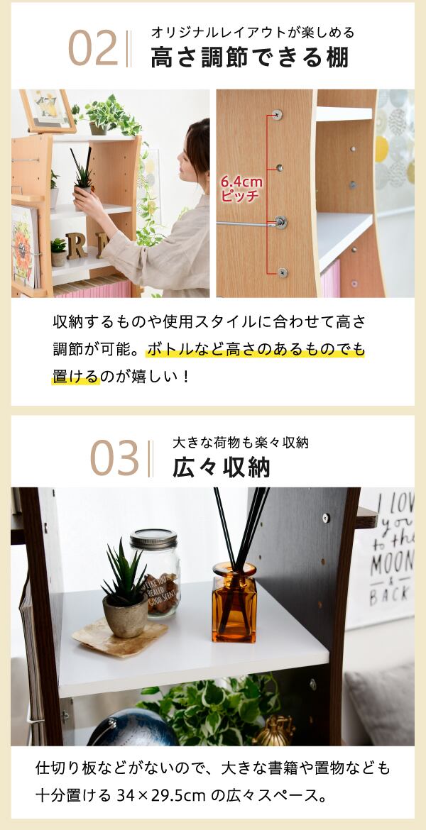 収納した本や小物を360度どこからでも取り出せる回転ラック。お部屋のレイアウトにアクセントをつけるウェーブデザイン。機能性とデザイン性を高次元で両立。