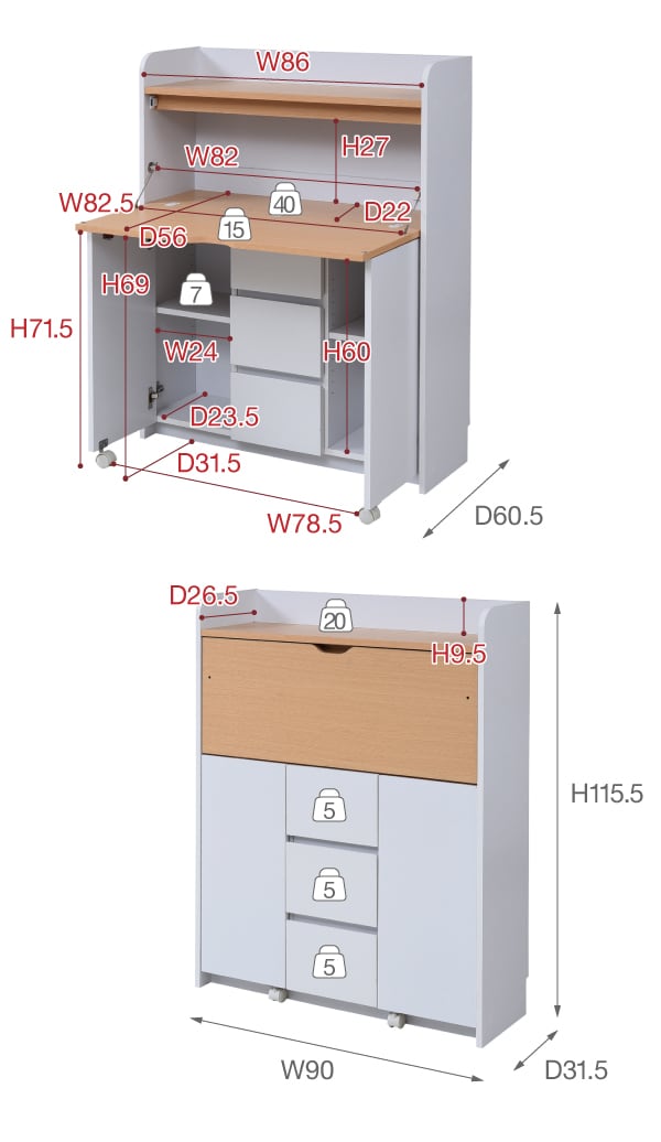 [外寸]幅90.0×奥行31.5/60.5×高さ115.5cm