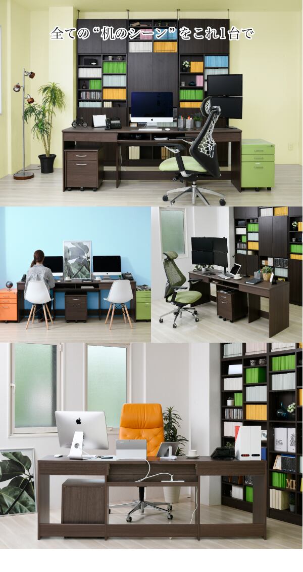 4つのサイズから選べるワイドデスク。幅広い天板はひとりなら広々と、ふたりでも十分使用できます。両サイドに付いた引き出しや中央のオープン部といった収納スペース、配線コードを収納するのに便利な背面のデザインなど、大きいだけではなく機能面も充実!オフィスや書斎など、さまざまなシーンで使えるシンプルで便利なデスクです。