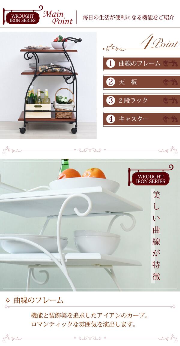スチールと木が融合したおしゃれなロートアイアンシリーズ。ロートアイアンの装飾が美しいキッチンワゴン。