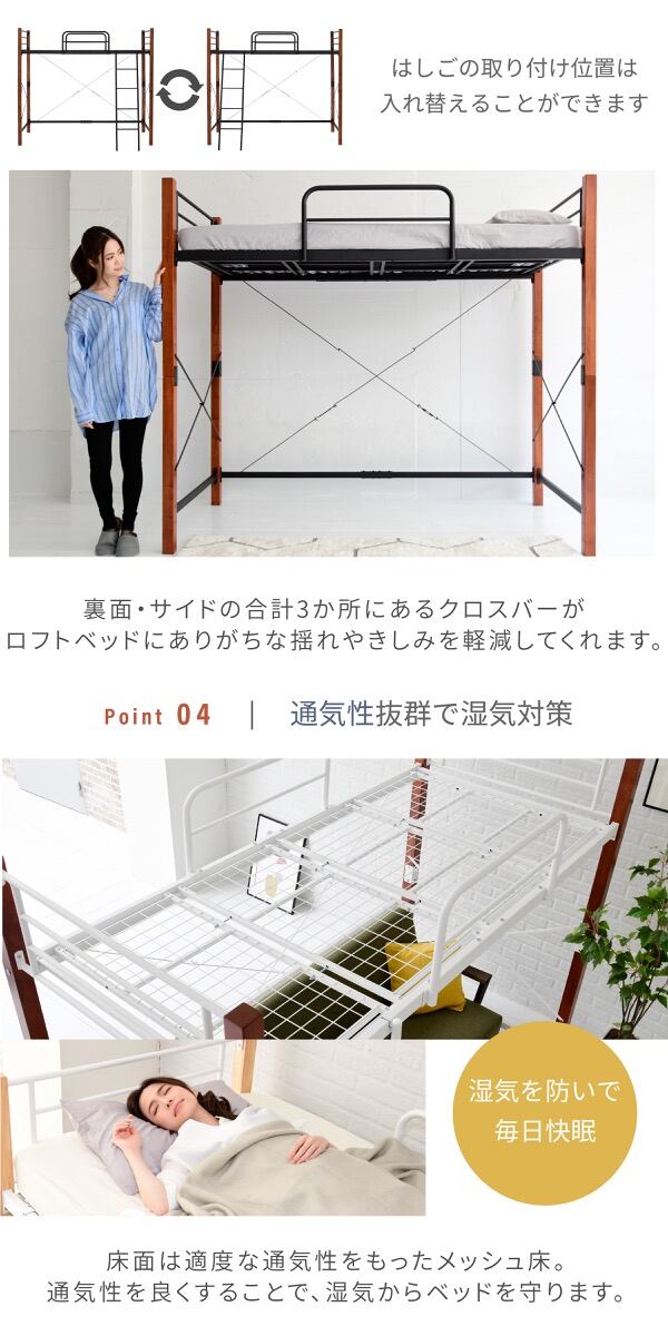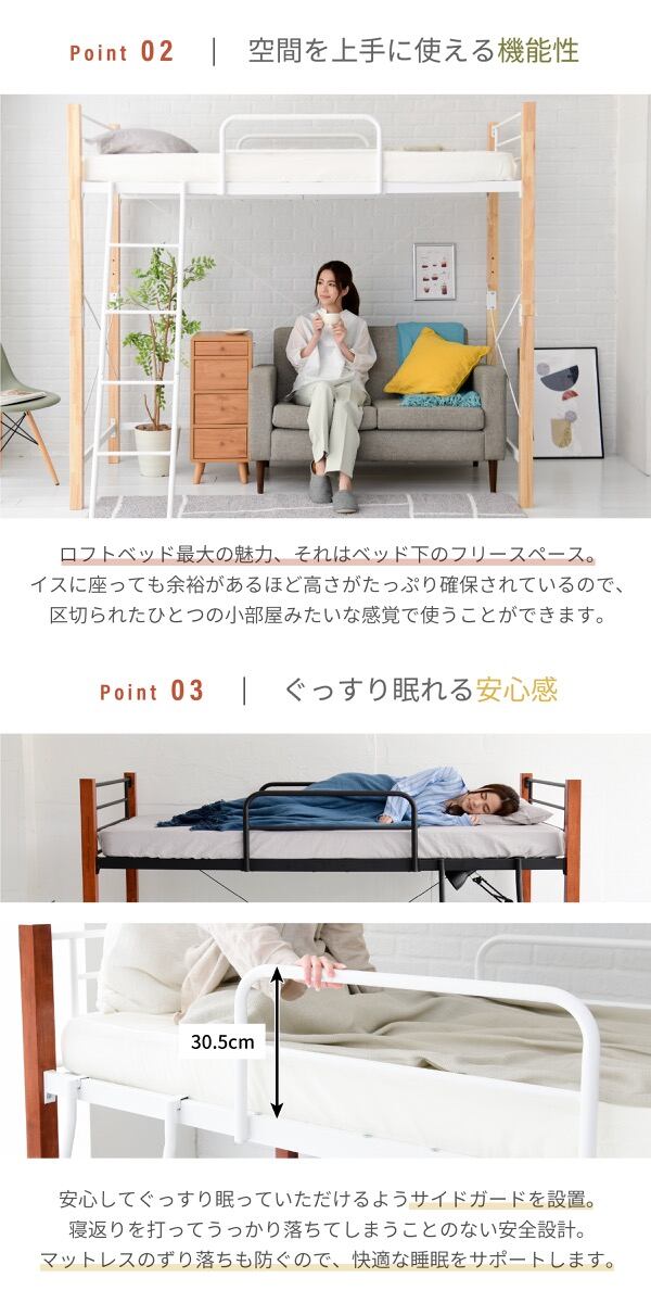 温かみのある天然木とクールなスチールのコントラストがおしゃれな、お部屋のスペースを有効活用できるロフトベッド。ベッド下のスペースにはデスクを置いたりソファを置いたり、生活空間の一部としても十分使える高さが確保されています。お部屋の雰囲気にあわせて選べる4カラー展開が嬉しい!