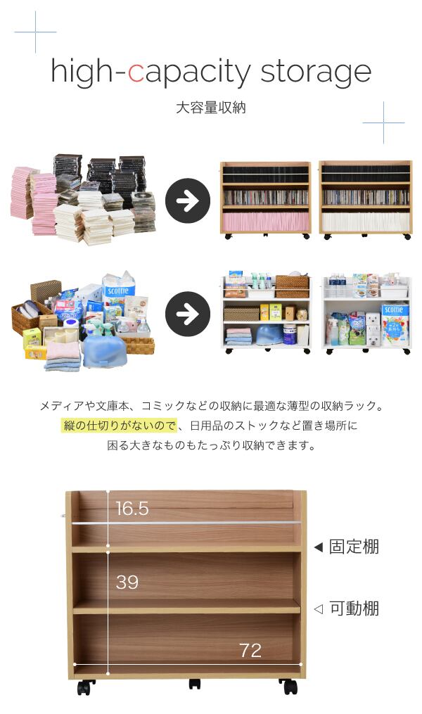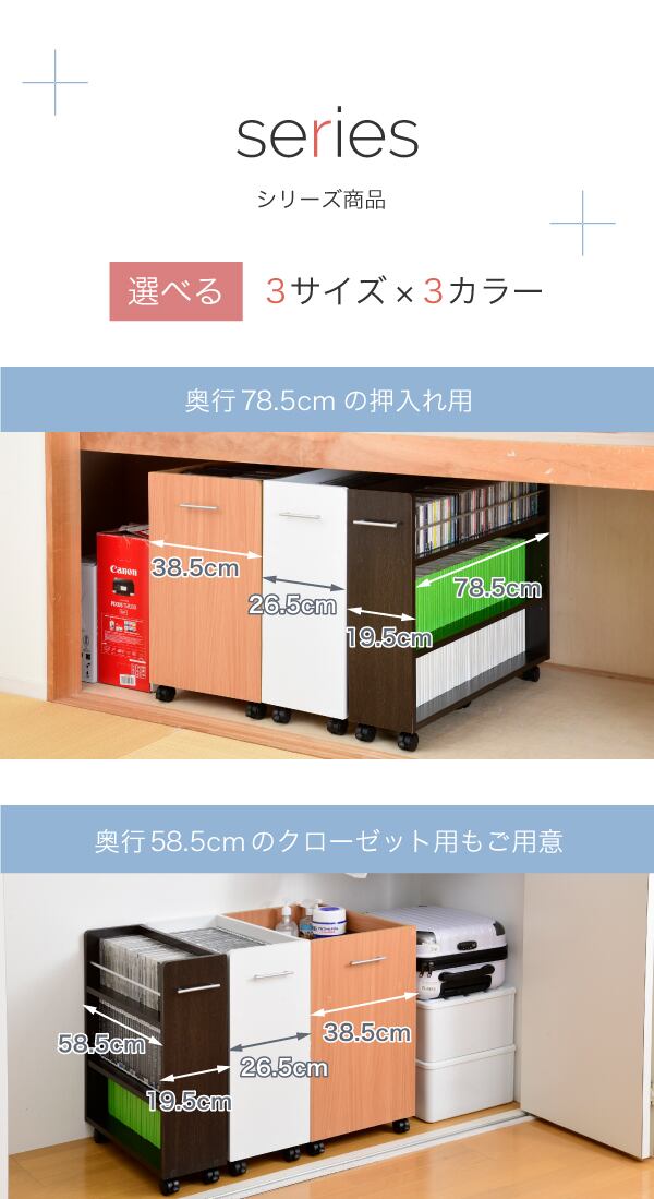 押入れにぴったり入る、キャスター付きラック2個組。押入れ内のスペースを有効活用して、A4ファイルやメディア、日用品を収納できます!