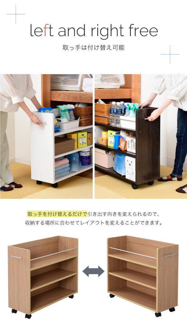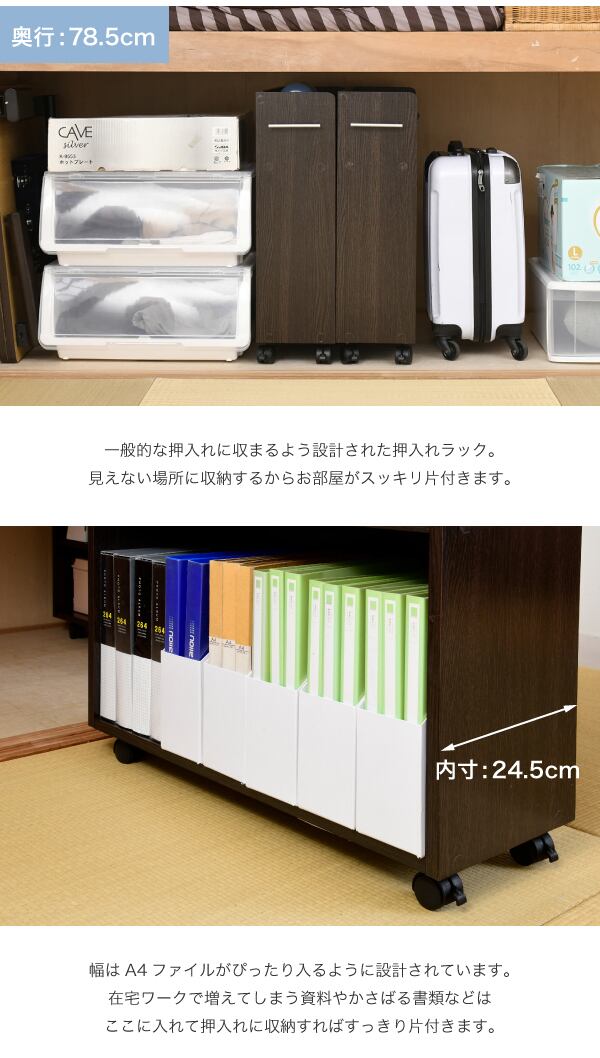 キャスター付きの便利な押入れラック2個組。取っ手はどちらにも取り付け可能なので、収納箇所の向きは左右入れ替えできます。A4ファイルがぴったり収納できるよう設計された幅26.5cm。本やメディア類や、日用品のストックなどの収納にぴったり。押入れ内のスペースを有効活用するのでお部屋をすっきり片付けられます。