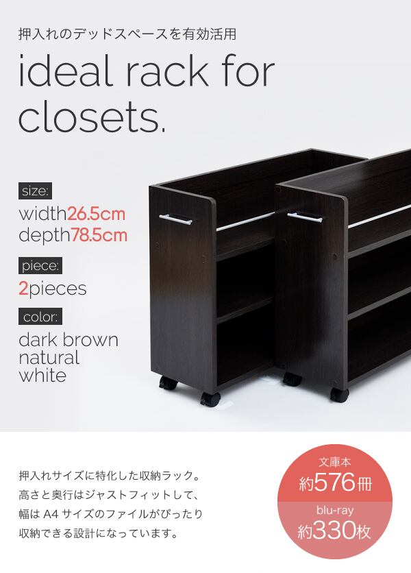 押入れ ラック 収納 ラック 本棚 2個セット 幅26.5 奥行78 .5 キャスター付き 隙間 ワイド ワゴン 棚 3段 大容量 CD DVD 本 漫画 整理 押し入れ収納 スライド