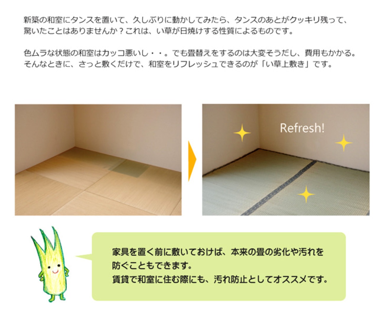 上敷きを敷くだけで畳のお部屋をリフレッシュ出来ます。日焼けしてしまった畳のリフレッシュに、新品の畳を汚さないためのカバーにご使用下さい。長さ110〜115cm程の国産(九州産)い草を使用しています。そのうち約91cmを使用しています。ヘリ際は強く白みを帯びます。(日焼けではありません、い草の根元と先端部分の色です。)い草は長いものほど高級になります。い草は先端部分が赤茶色く、根元が白く真中が青(緑)色です。真中の良質な青の部分を多く使用するほど、丈夫で綺麗な仕上がりとなります。またイ草は使用するうちに日焼けをしますが、真中の青の部分を多く使用したものほど、全体が綺麗にムラなく日焼けし、味が出ます。こちらの商品は畳表と同じ織り方の糸引織で仕上げました。双目織りと比べて、い草の打ち込み本数が多いため丈夫です。表面が滑らかなので、ホコリなどがたまりにくいのが特徴です。長くご使用されたい方や、耐久性をお求めの方には糸引織をおすすめします。国産(九州産)のい草を使用しています。国産い草は一本一本が太く、表皮が厚く繊維がキメ細かいので弾力性があり、耐久性に優れています。い草には空気の清浄化作用、湿度の調節作用があり、汚れにくいといった特徴があります。い草にヒバエッセンス加工を施しています。(抗菌防臭効果)表裏の両面が使えて経済的です。