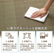 い草カーペットは和室の畳をカバーし、汚れや傷を防止してくれます。通常のカーペットと違い毛足が無いのでゴミや髪の毛などがからみにくく、掃除機やコロコロ(粘着シート)での掃除がラクにできます。裏面には滑り止め付きの不織布を貼っており、床を傷つけずソフトな踏み心地でフローリングの上でも滑りにくいです。い草には優れた消臭機能があり、汗臭やペット臭などの原因となる物質を消臭してくれます。い草には喘息の原因の一つとも言われる二酸化窒素や、シックハウス症候群の原因の一つのホルムアルデヒドを吸着してくれます。天然物質としては抗菌力の高い青森ヒバから抽出したヒノキチオールをい草生地に使用しており、抗菌防臭効果があります。い草の癒される香りとサラッとした肌触りはそのままに、和室や洋室にも合わせられるインテリア性の高いナチュラルシンプルなデザインで仕上げています。