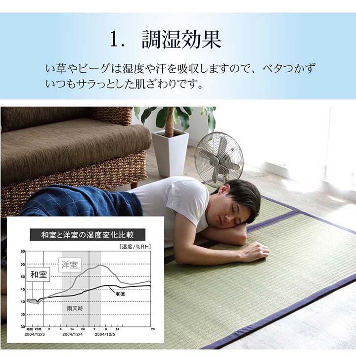 その為い草特有の機能である湿気の吸放出効果も約2倍程となり、夏場のムシムシとした湿り気を吸収してくれる他、寝転がった時の汗のべとつき感も無く、さらっとしたタッチ感とざっくりとした踏み心地がくせになる商品です。