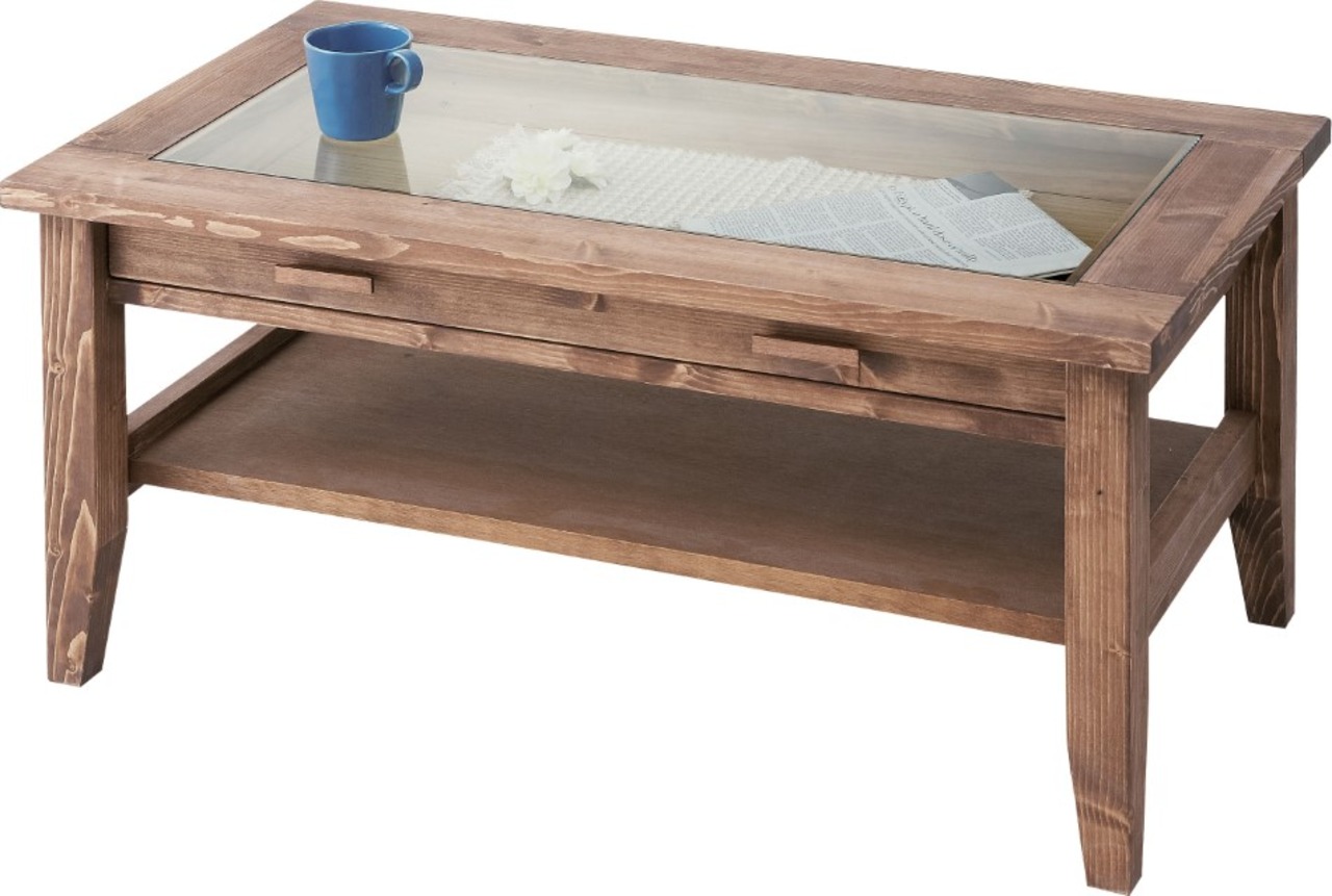 ルーアン センターテーブルW90 天然木(パイン)フレーム 引出し付ディスプレイ 強化ガラス天板
