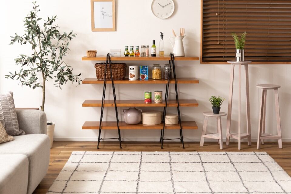 ●折りたたみ(フォールディング)できるシェルフ。●天然木とスチールの組み合わせでデザイン性抜群。●簡単に設置ができるのでイベント会場やフリーマーケットなどアイデア次第で自宅以外でも活躍します。 ●コンパクトに折りたたむことができるので、使わない時や移動の時は狭い隙間に収納可能。●天然木(パイン)を使用した風合いのあるシェルフ。棚板のサイド部分も同じ天然木で縁取りをしたこだわり仕上げ。●フレームの脚先にはアジャスターが付いているのでガタツキ調整も可能。●脚の下段部分にはロックバーが付いているので、脚が勝手に閉じてしまう事もなく安心です。