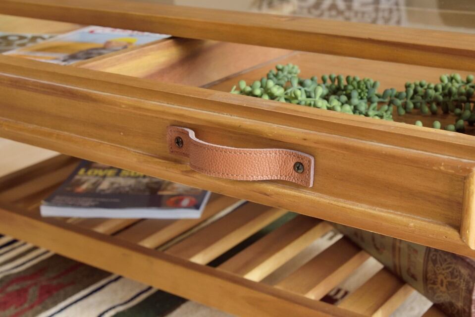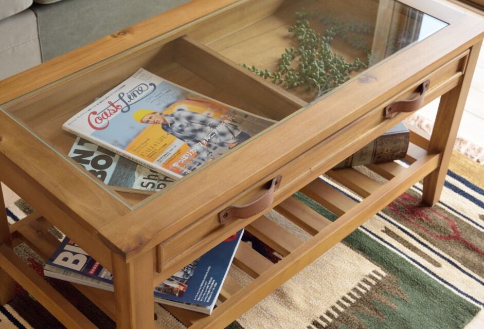 天板にガラスを使用しているので、引出しにしまったものが見えるコレクションテーブル。