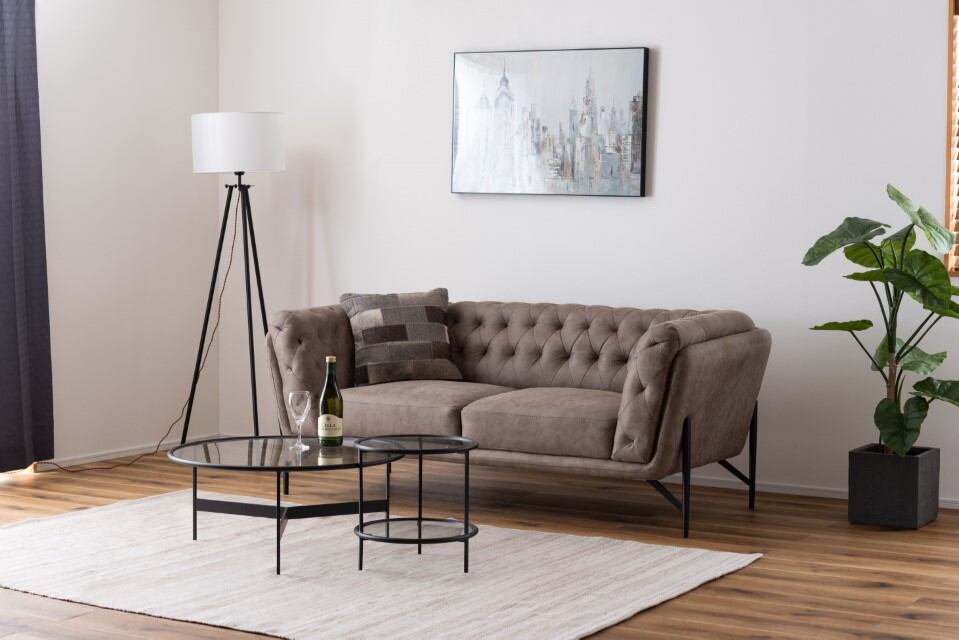 ●シンプルでスタイリッシュなガラステーブル●マットなブラックアイアンの滑らかな曲線とハードなガラスを組み合わせたテーブルに新サイズが登場しました。リビングテーブル/サイドテーブルとして使用したり、2台並べてネストテーブルとしても使用できます。脚部は10mm角のシャープなラインが際立ち、透明なガラス天板との組み合わせは圧迫感の無い開放的な空間を演出します。●ガラス天板は取り外しが可能●フェルト付きのガラス受け●天板は枠より下側にあります●床への傷を防止する保護キャップ付き