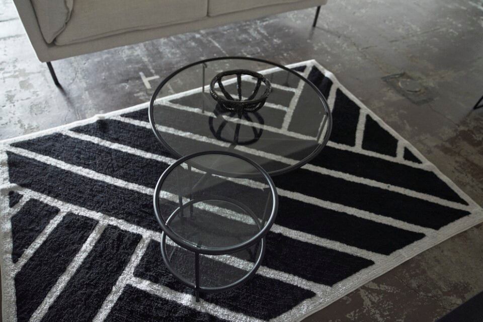 ●シンプルでスタイリッシュなガラステーブル●マットなブラックアイアンの滑らかな曲線とハードなガラスを組み合わせたテーブルに新サイズが登場しました。リビングテーブル/サイドテーブルとして使用したり、2台並べてネストテーブルとしても使用できます。脚部は10mm角のシャープなラインが際立ち、透明なガラス天板との組み合わせは圧迫感の無い開放的な空間を演出します。●ガラス天板は取り外しが可能●フェルト付きのガラス受け●天板は枠より下側にあります●床への傷を防止する保護キャップ付き