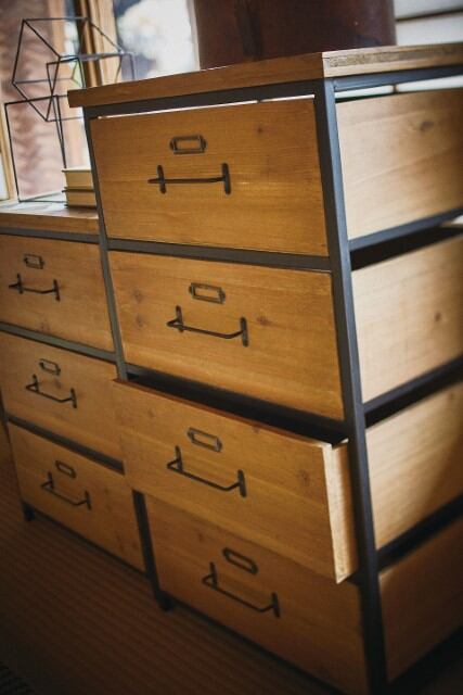 ●和風テイストを取り入れた、ヴィンテージスタイルのチェスト。●天板面はヘリンボーン柄で仕上げたこだわり仕様。●天然木(杉)の風合いを活かしたデザインなので、和室・洋室どちらにも合わせられる使いやすいデザイン。●引き出しが4杯付いているので、たっぷりと収納できます。●引き出しの前板にはラベルフレームが付いているので、仕分け収納に便利。
