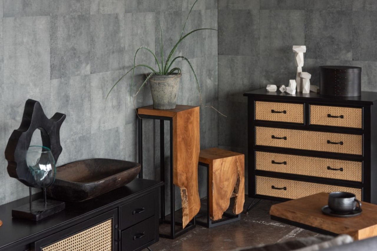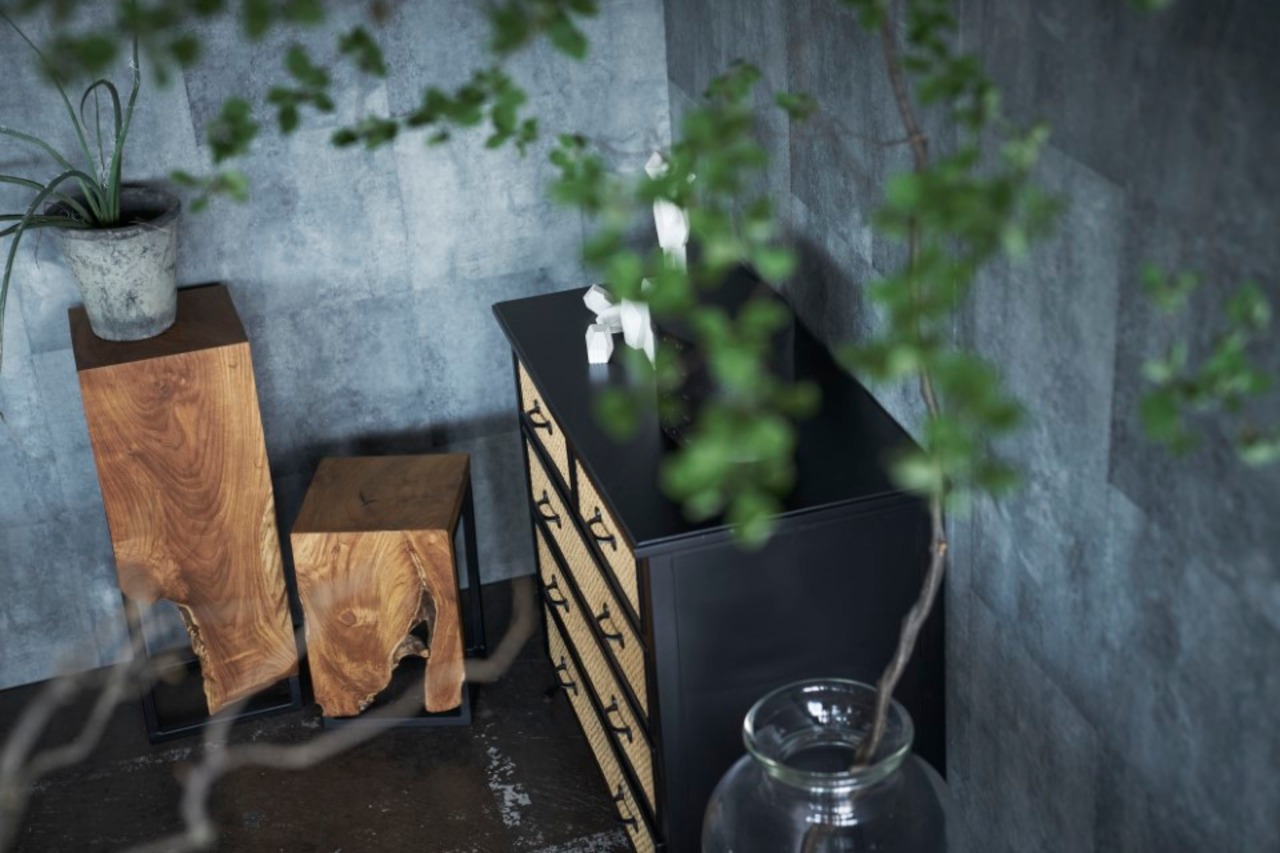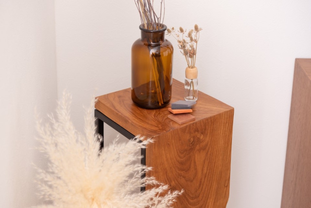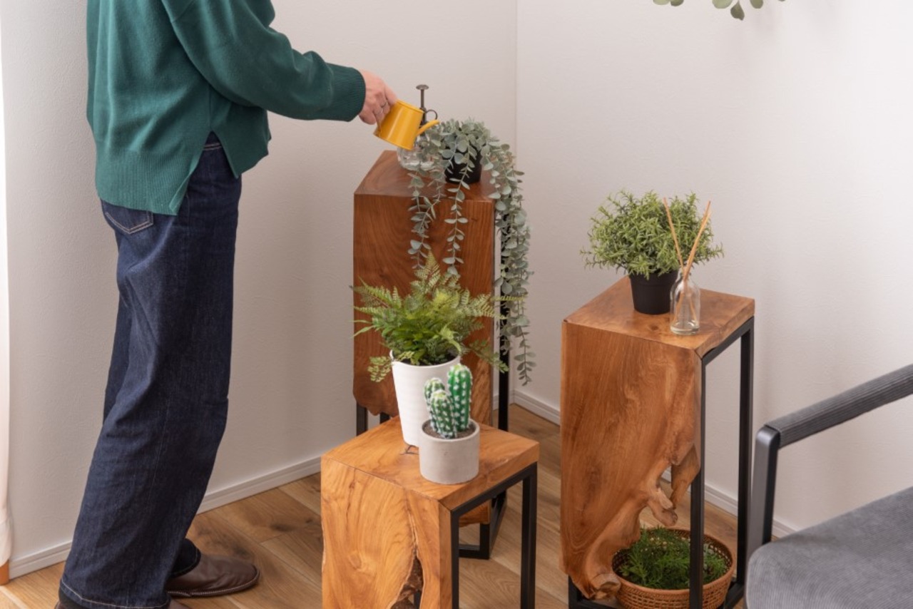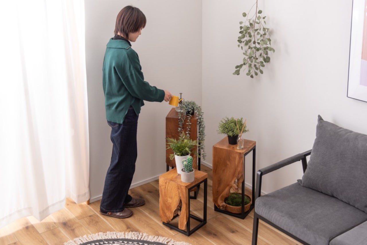 段違いで並べて使えるプランタースタンドと、座面下に入れ込める形のサイドテーブル、4アイテムでご用意致しました。