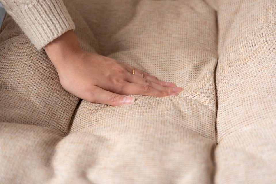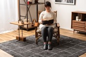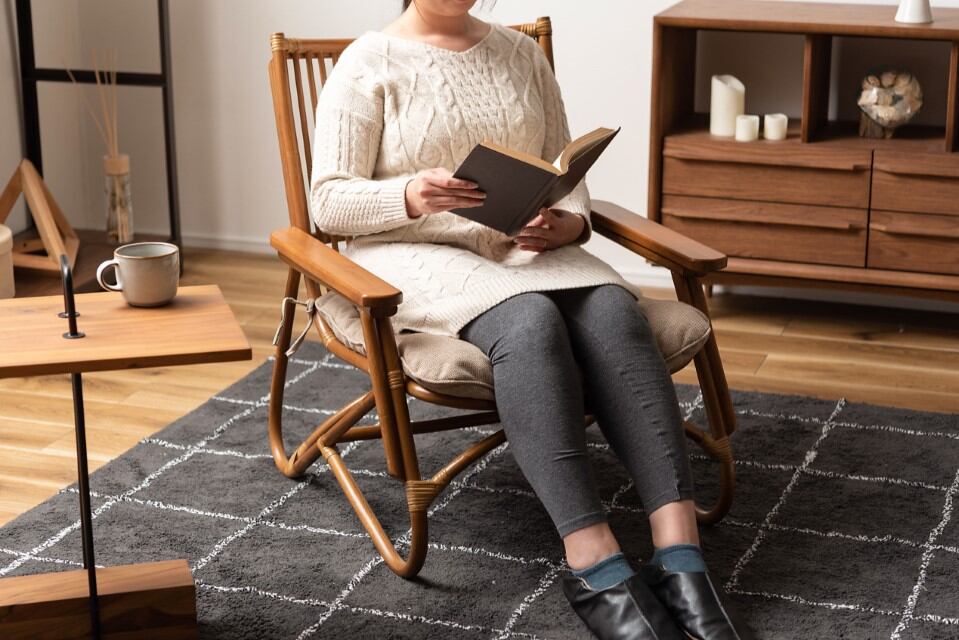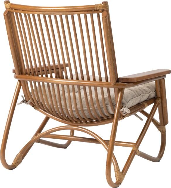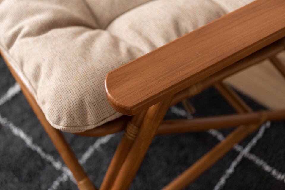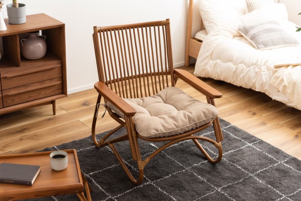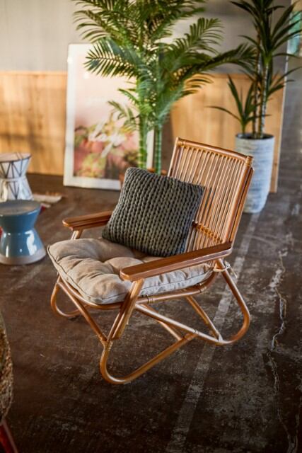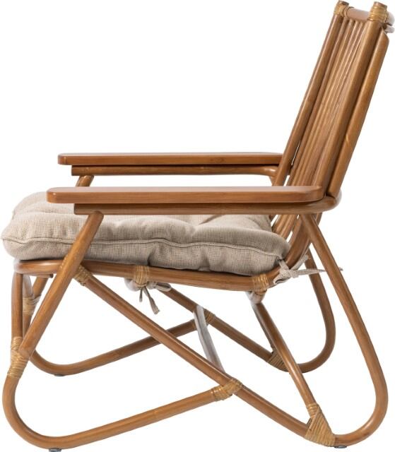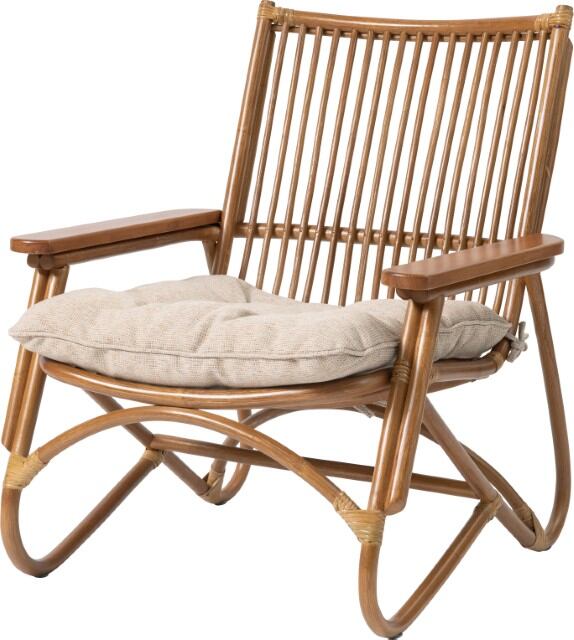 ●脚のカーブが美しい、天然木×ラタンのパーソナルチェア。●ゆったりと座りやすい形状と、印象的なデザインが特徴です。●肘掛けには天然木(チーク)を使用。天然木のぬくもりがしっかりと手に馴染みます。●ラタン(籐)ならではの、しなやかで柔らかい曲線も魅力の一つです。●背もたれには緩いカーブを掛けているので、ゆったりとくつろぐことができます。●ほどよいクッション性のある座面クッションは取り外しが可能です。