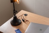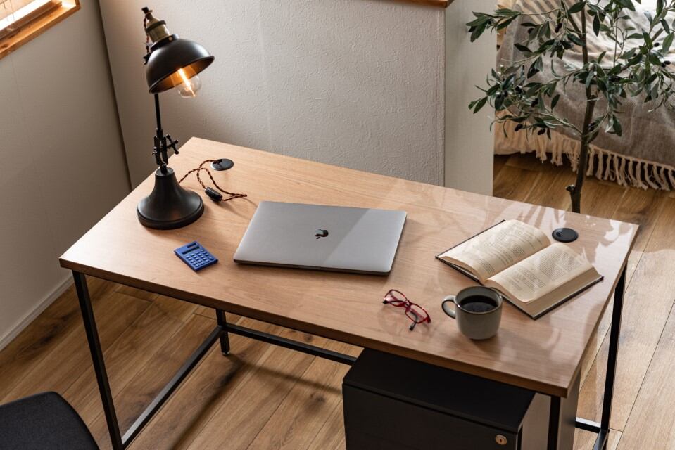 ●デスクは強度の高い木目調のメラミンシートを採用。お手入れも簡単でいつでも清潔な状態をキープする事ができて安心です。フチ部分は積層合板のシートでアクセントを入れたこだわりデザイン。天板の左右にコード穴を付けてあるので、配線処理も楽に行なえます。