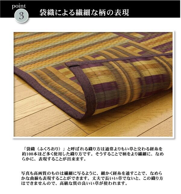 メーカー独自の超特殊な織り方で仕上げた『柳川段通』シリーズのイ草カーペットです。柳川段通の特長として①厳選したイ草を通常の商品よりも約2.2倍(メーカー比)使用しています。②ヘリ生地は久留米織りの生地を使用しています。久留米織りとは福岡県久留米地方の伝統的な織りもので、着物や洋服によく使われている貴重な織りものです。③本商品の織り職人はこの道一筋20年〜40年の熟練の匠です。柄の特長として『和室・洋室どちらにも似合う敷きやすい段通』をコンセプトに作りました。永くご使用頂きたいので飽きのこない格子柄で、細部にはドットやボカシといった変化を持たせたデザインに仕上げています。さらに本商品は四重に織ることで耐久性、ボリューム感、圧倒的な存在感のある商品に仕上げました。国産(九州産)のい草を使用しています。一本一本が太く、表皮が厚く繊維がキメ細かいので弾力性があり、耐久性に優れています。い草には空気の自然浄化作用、湿度の調節作用などがあります。また汚れにくく、使用するうちに黄金色に変化し味が出ます。い草にヒバエッセンス加工を施しています。(抗菌防臭効果)