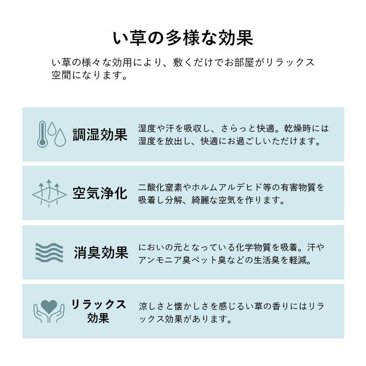 い草には空気の清浄作用、湿度の調整作用があり、汚れにくいといった特徴があります。敷くだけで畳のお部屋をリフレッシュできます。