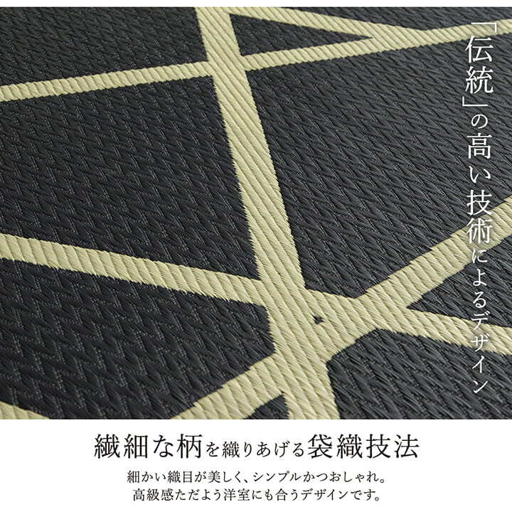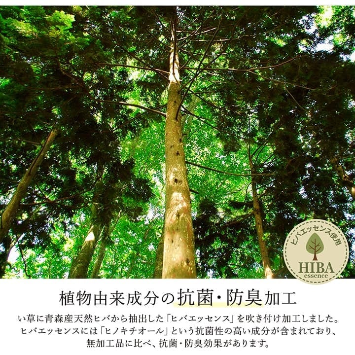 現代のライフスタイルに合う、モダンなデザインのい草カーペットです。細かい織目が美しく、敷くだけで高級感が漂います。裏にはウレタンフォームでほどよいクッション性を持たせているので床を傷つけにくく滑りにくいです。国産(九州産)のい草を使用しています。一本一本が太く、表皮が厚く繊維がキメ細かいので弾力性があり、耐久性に優れています。い草には空気の自然浄化作用、湿度の調節作用などがあります。青森産天然ヒバから抽出した植物由来成分で抗菌防臭加工をほどこしています。希少な国産い草を用いて、ベテラン職人が、長年の経験を活かし、国内工場で丹念に織りあげました。ご家族のくつろぎの場に、安心して使用いただけます。