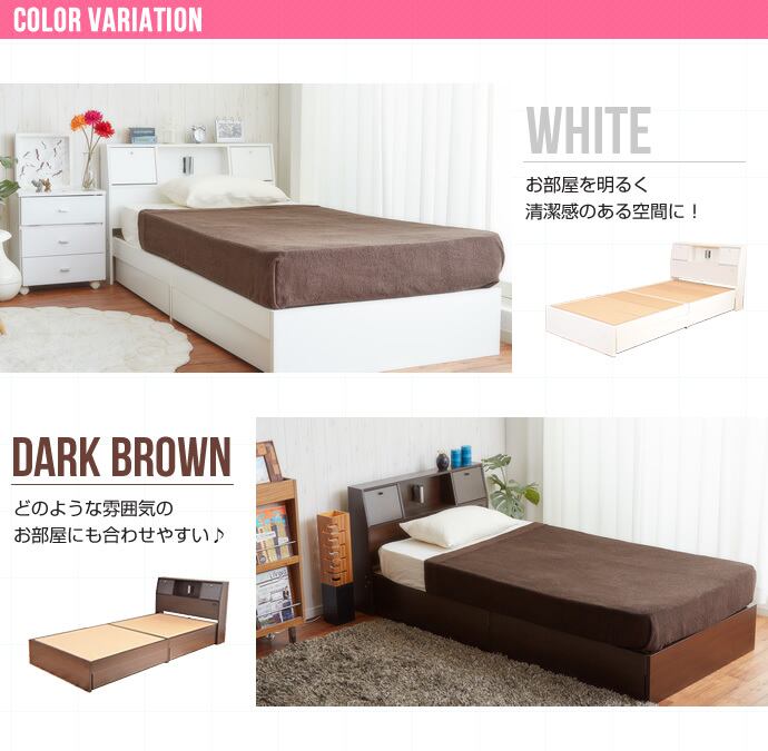 大人気の収納付きベッド。ヘッドボードにフラップテーブルに照明、コンセント、収納棚が付き、ベッド下にはキャスター付の引出しまで付いた収納付きベッド。 フラップテーブルに携帯電話を置いて充電しながらテレビを見る、なんて使い方もできてしまいます。