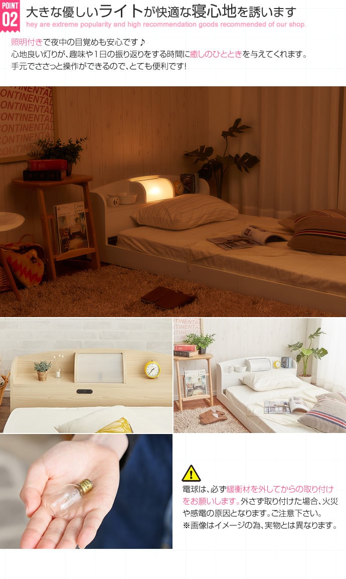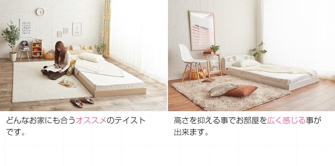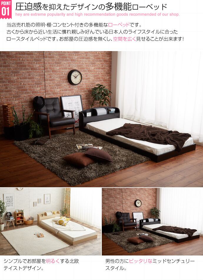 大人気のローベッド。お客様のご要望を1つにした照明棚付きのフロアベッド。【高いデザイン性、照明、棚付き】3拍子揃った大人気のローベッド!