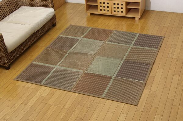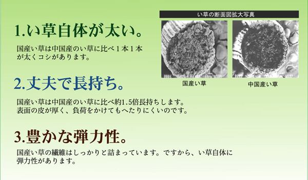 国産(九州産)い草を使用しています。一本一本が太く、表皮が厚く、繊維がキメ細かいので弾力性があり、耐久性に優れています。い草には空気の自然浄化作用、湿度の調節作用などがあります。また汚れにくく、使用するうちに黄金色に変化し味が出ます。い草にヒバエッセンス加工を施しています。(抗菌防臭効果)