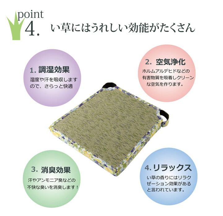 水彩タッチの花柄が特徴のい草クッションです。中材にウレタン40mmを使用していますので、底付き感のないふかふかしたクッションです。い草の効能として1.綿の約3倍の吸湿力 2.蒸れにくい。汗による湿気を吸うことにより温度を下げ快適な就寝を促します。 3.汗のにおいを軽減。汗のにおいの元となる化学物質を90%以上抑えます。デスクやダイニング用の椅子に最適です。