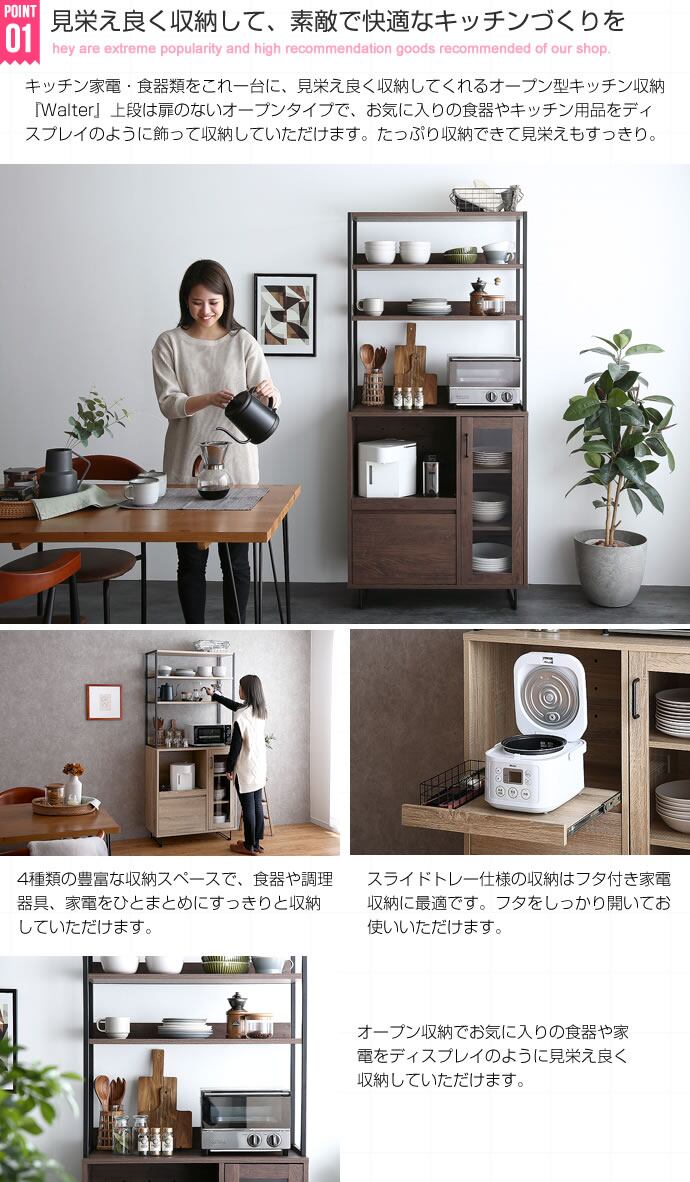 1台で食器や調理家電をまとめて収納できるオープン棚・ガラス扉・スライドトレー付き食器棚です。